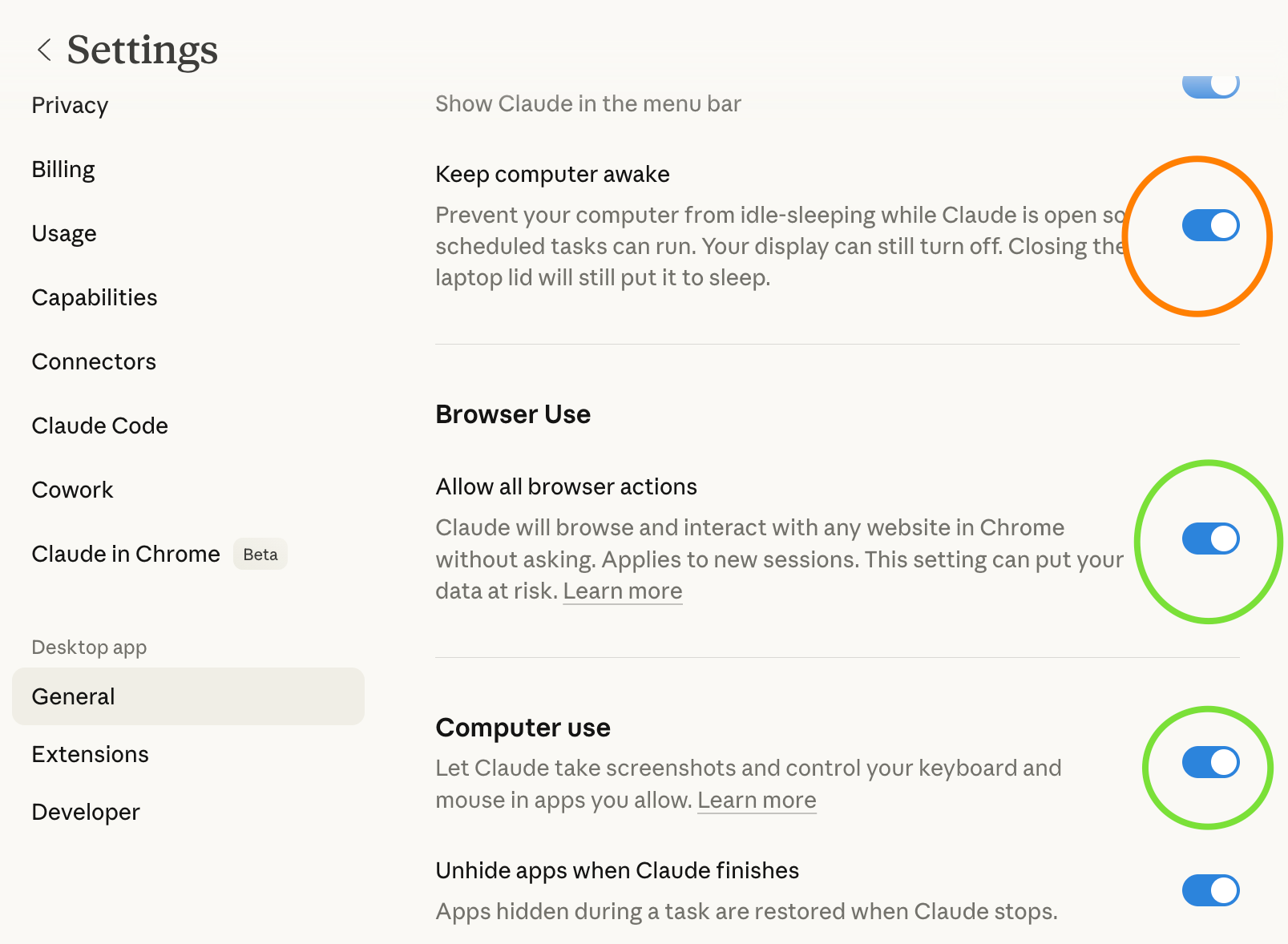 2. The Claude desktop application. Download it from claude.ai. As of early 2026, Cowork mode—the feature that enables browser control and autonomous task execution—is available on macOS. You will want to open Settings and ensure that Computer Use is toggled on under the General tab (green circle). Also make sure to enable Allow all browser actions (green circle). You may also need to enable "Keep computer awake" if your tasks will run while your laptop is closed (orange circle)