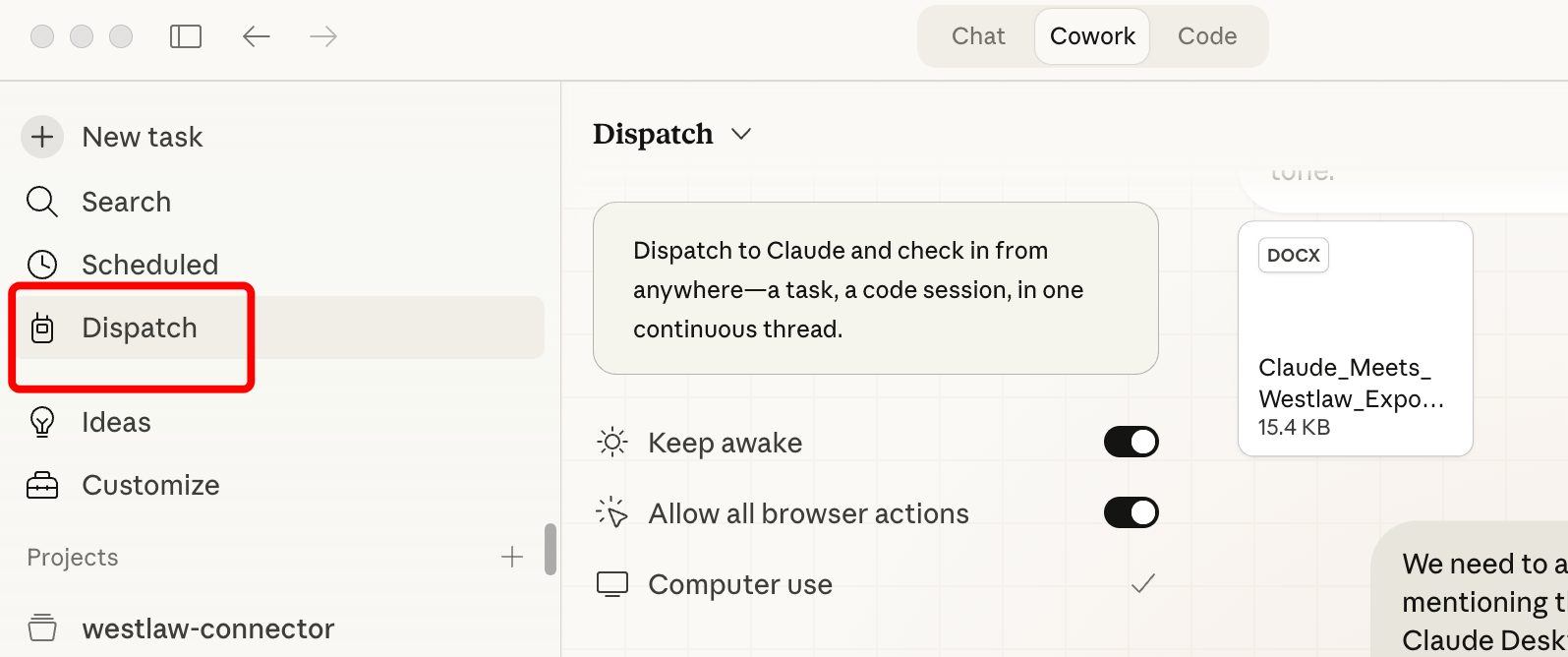 Make sure your Claude desktop app is updated to a version that includes the Dispatch capability — this is the mode that allows Claude to manage long-running tasks, coordinate browser interactions, and deliver files back to you. If you open the Claude desktop app and see a Dispatch or Cowork tab, you have the right version. If not, check for updates. The feature has been rolling out to Pro and Max subscribers since early 2026. You should see something like this. Notice that I am using the Cowork tab, not Chat or code.