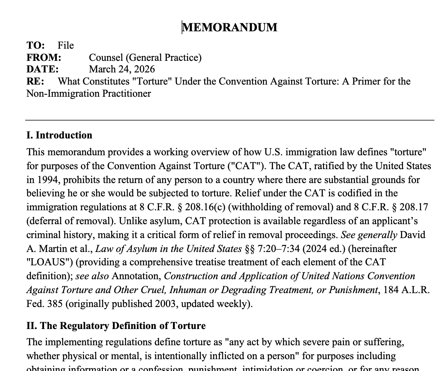 Research memoranda with secondary authority. Again, this was tested live. A colleague unfamiliar with immigration law needed a memo on what constitutes “torture” under the Convention Against Torture. Claude searched Westlaw, found 37 cases and 444 secondary sources, read key circuit court decisions and multiple sections of the Law of Asylum in the United States treatise, and produced a 1,000-word memo citing both cases and treatise sections in Bluebook form—including an ALR annotation (184 A.L.R. Fed. 385) and a Tulane Law Review article (96 Tul. L. Rev. 1033). No purely case-law tool could have produced the treatise and law review citations that made the memo useful as a practical research starting point.