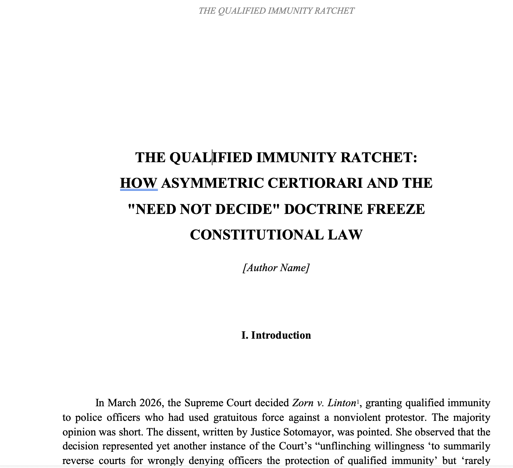 In a second session, Claude navigated to Lexis—a separate tab, a separate database, the same workflow. The task was more ambitious: research the qualified immunity “ratchet” problem raised by Justice Sotomayor’s dissent in Zorn v. Linton, 607 U.S. ___ (2026), decided this very week. Claude ran multiple searches on Lexis. The first, targeting secondary materials on qualified immunity asymmetry, returned over 10,000 results. Claude identified a Columbia Law Review student note from 2025 on the decline of summary reversals (125 Colum. L. Rev. 1695) and a Washington Law Review article on per curiam signaling (98 Wash. L. Rev. 427). A second search—for cases using “need not decide” alongside “qualified immunity” and “clearly established”—returned 2,900 cases and 178 secondary sources. Claude then used all of this material to produce a 5,000-word law review article with over thirty Bluebook footnotes, organized around two structural critiques of the qualified immunity doctrine. The article cited cases from the Supreme Court, the Fifth Circuit, the Ninth Circuit, and the D.C. Circuit, as well as law review articles by Joanna Schwartz, William Baude, Aaron Nielson, Christopher Walker, and others—all found through Lexis, not through any AI-native legal database.