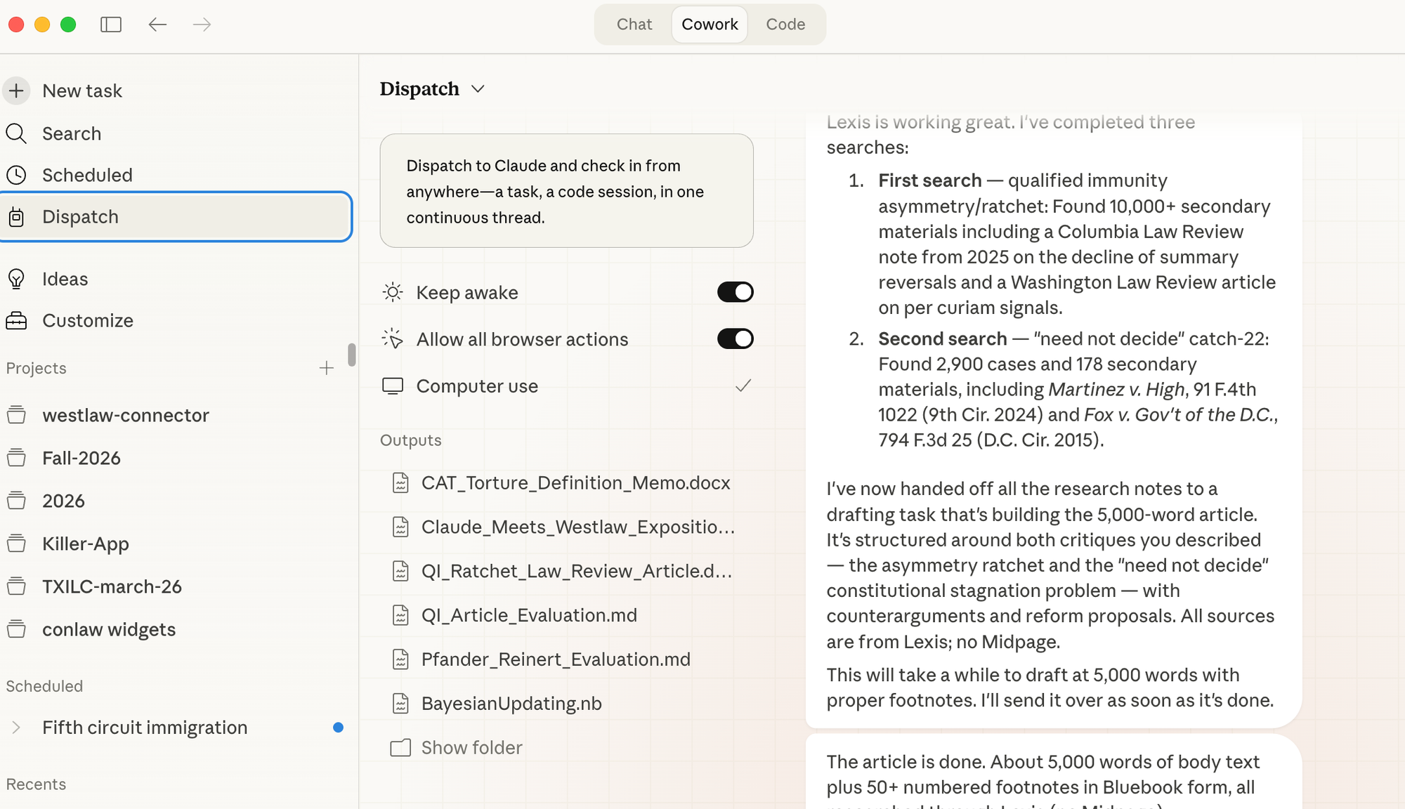 Moreover, focusing on Claude is a mistake. My inspiration for this blog post was a former student who yesterday contacted me excitedly to let me know that in her mostly transactional legal practice she was now finding great success connecting Manus – an agentic AI recently purchased for $2 billion by Meta – to Lexis. When today she showed me the process in action – and let me know that she was willing to pay $200 per month for the privilege – I just put two and two together and speculated that Claude with its new "Dispatch" facility might now be able to do the same thing. For less money! And what Claude can do today, I am sure that Gemini and ChatGPT will be able to do shortly. While browser emulation is not quite commodity technology yet, by the end of 2026 it is likely to be so. The argument for AI-controlled legal research and drafting is overwhelming.