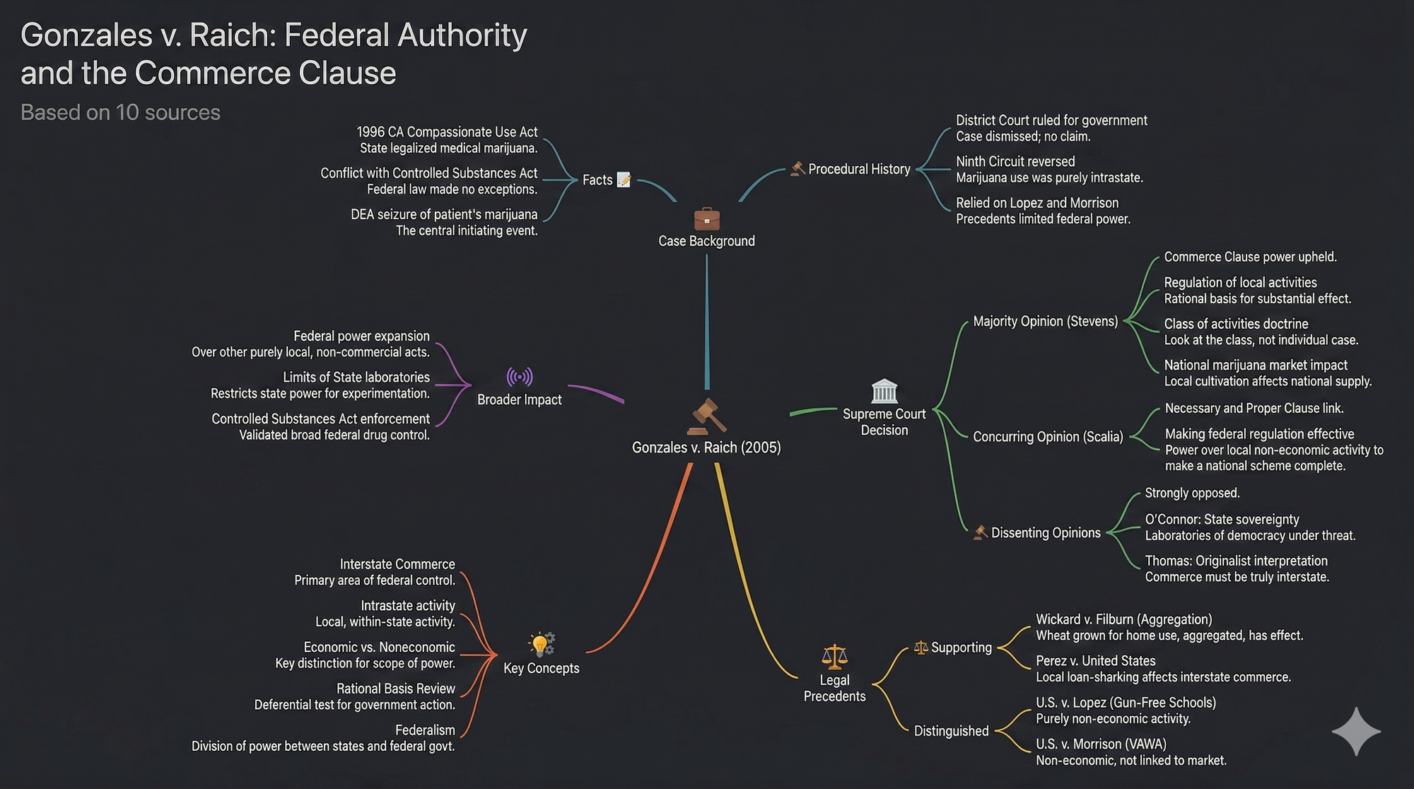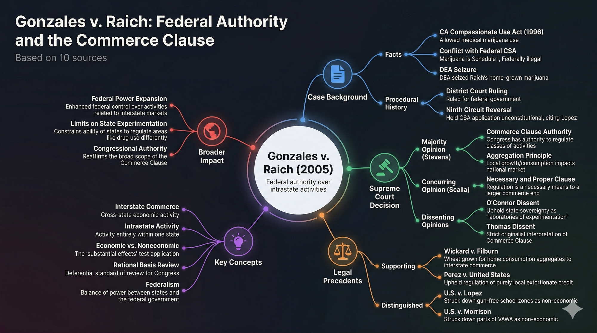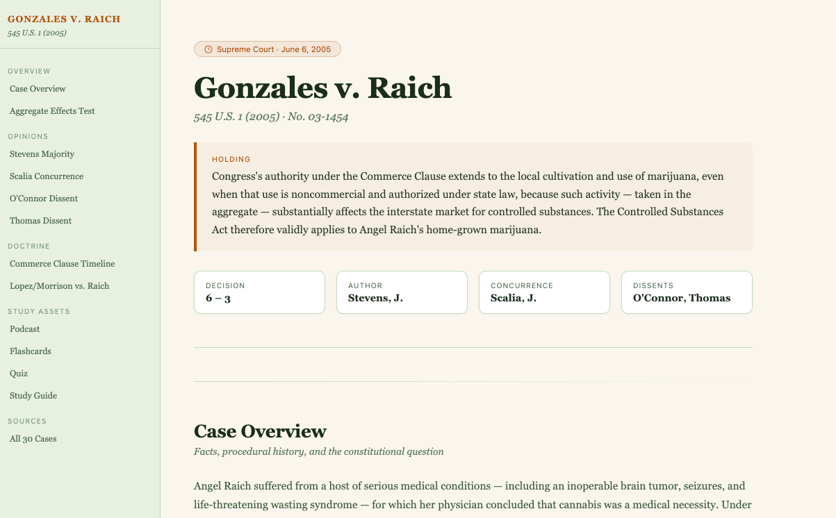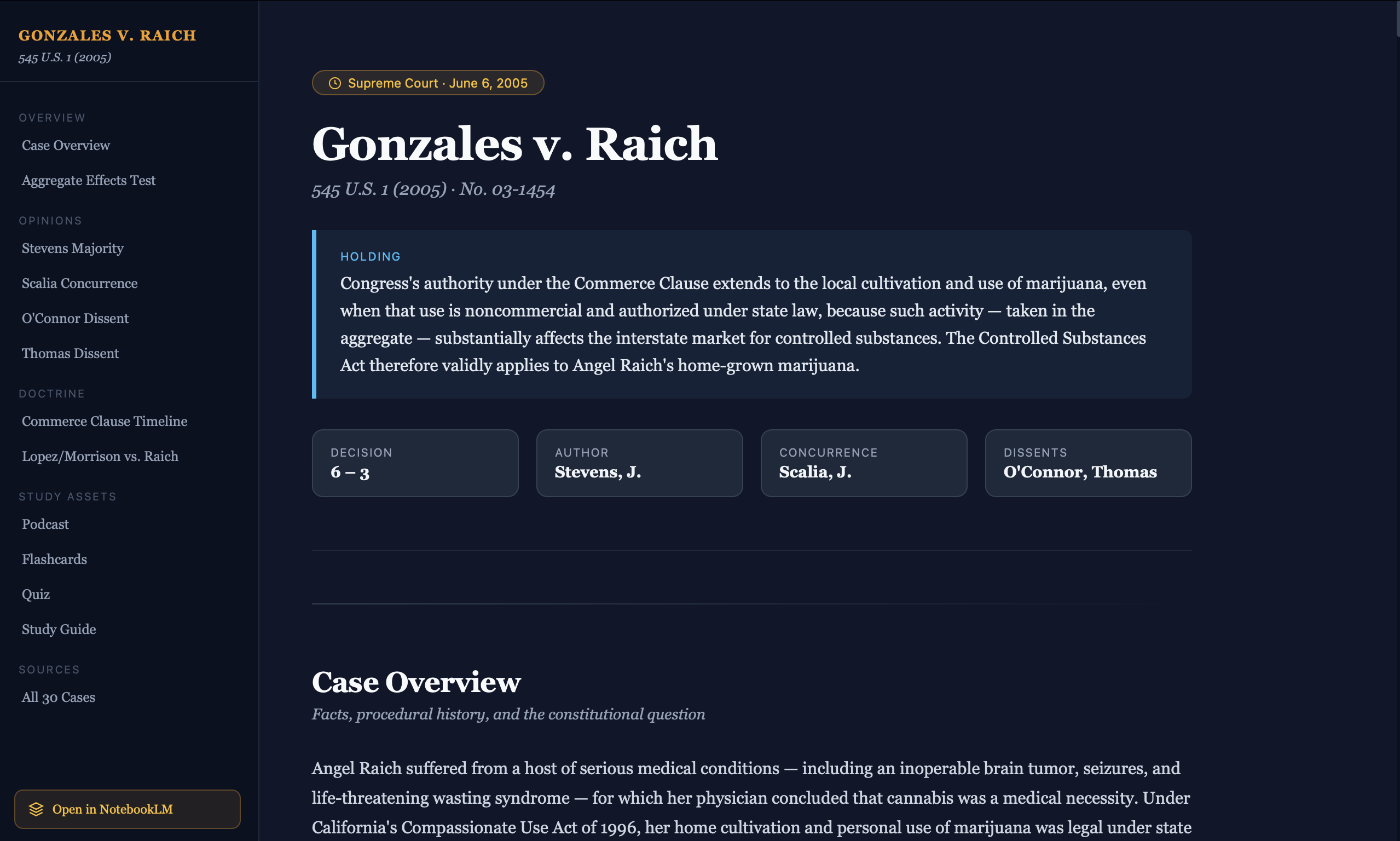 Download all studio artifacts from the NotebookLM notebook titled "Gonzales v. Raich — Commerce Clause." Then build a website that includes: the downloaded artifacts (audio overview, flashcards, quiz, and study guide); a summary of the case and holding; an explanation of the aggregate effects test as the doctrinal centerpiece; a summary of each opinion — Stevens majority, Scalia concurrence, O'Connor dissent, and Thomas dissent — covering the reasoning and key arguments; a timeline of Commerce Clause doctrine from Gibbons v. Ogden to Raich; a comparison of Lopez and Morrison's limits against Raich's expansion; and a list of all 30 source cases with one-sentence descriptions. Deploy the completed website as a new Netlify site using the Netlify connector. Return the live URL when done.