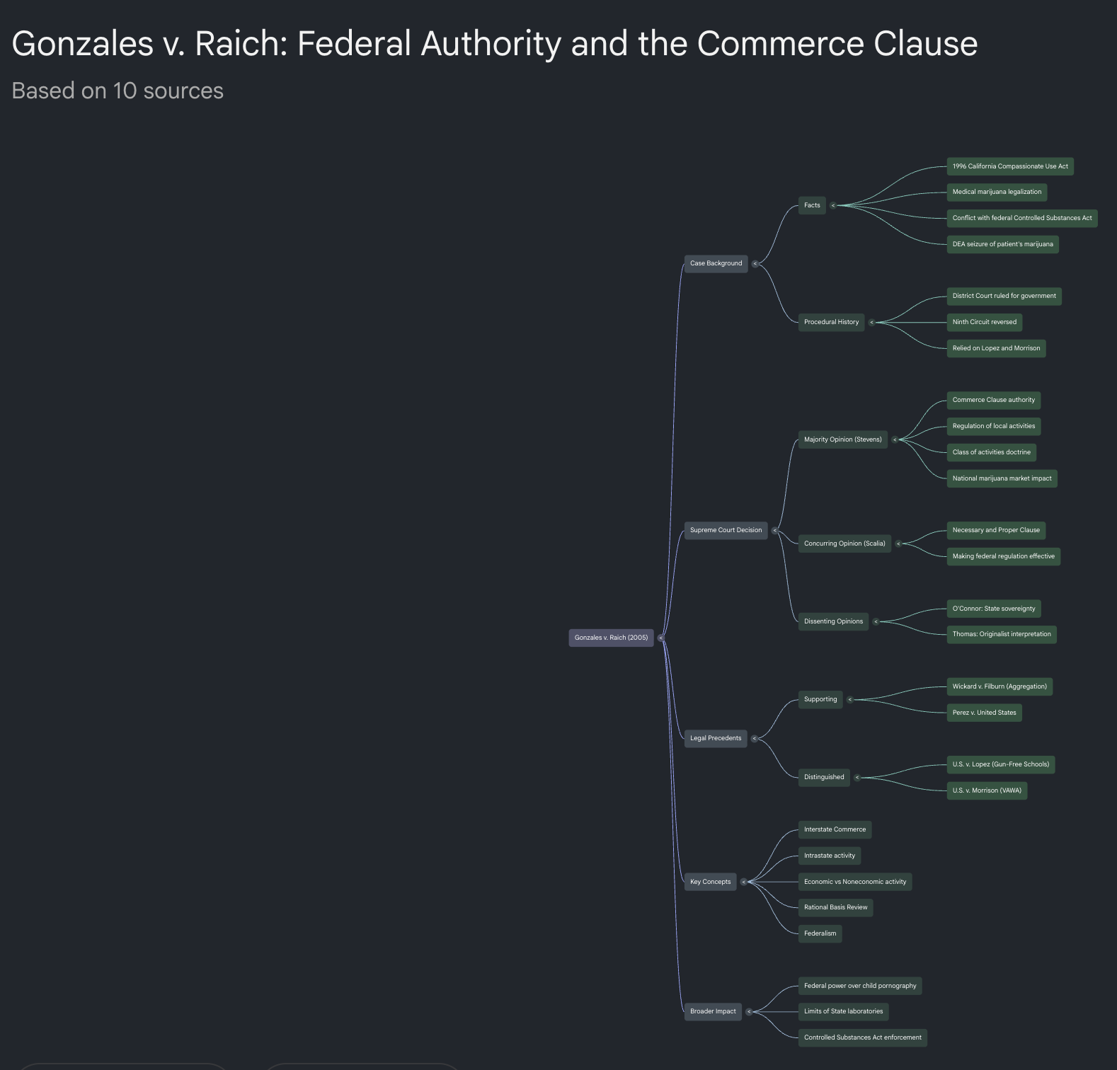 Gemini also lets you enhance various artifacts produced in NotebookLM even when you can't generate those artifacts from within Gemini itself or directly port them over. One example is "Mind Maps." NotebookLM can easily produce "mind maps" that represent a hierarchical faceting of its materials. Here's a Mind Map generated from within NotebookLM using the same example notebook on Gonzales v. Raich.