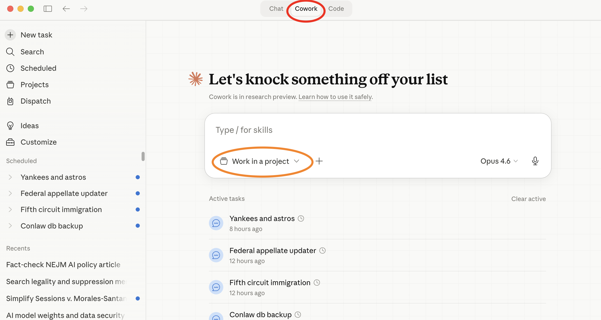 The best modality for most Claude-NotebookLM conversations will be using Claude Cowork. You do this by selecting the Cowork tab (circled in red) in the Claude Desktop app. And you will likely also want to be working in a Project associated with a folder (directory) on your local machine. Select the drop down arrow in the (circled in orange) "Work in a project" area and pick either an existing or new folder. (You can have multiple folders associated with a project).