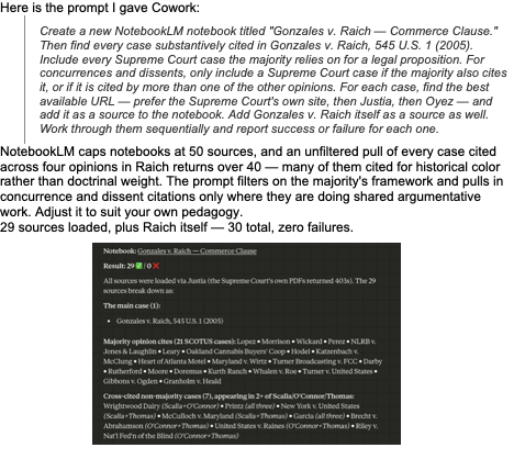 And, lest you say "what's really the point of that," consider a more complex prompt that says for each case listed in the attached file (which has a dozen cases) create a NotebookLM notebook titled in a way that evokes the case name and include a discussion of every major precedent cited therein. The advantage of using Claude is that you effectively have a computer interfacing with NotebookLM directly rather than having to hand type everything in a human-oriented user interface. A student, for example, could put in the table of contents from a course they were taking and get a mammoth book tracing the doctrinal history of each of the cases in the course. Won't your professor be impressed!