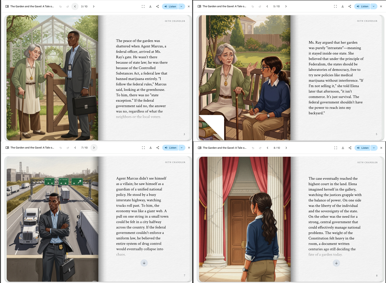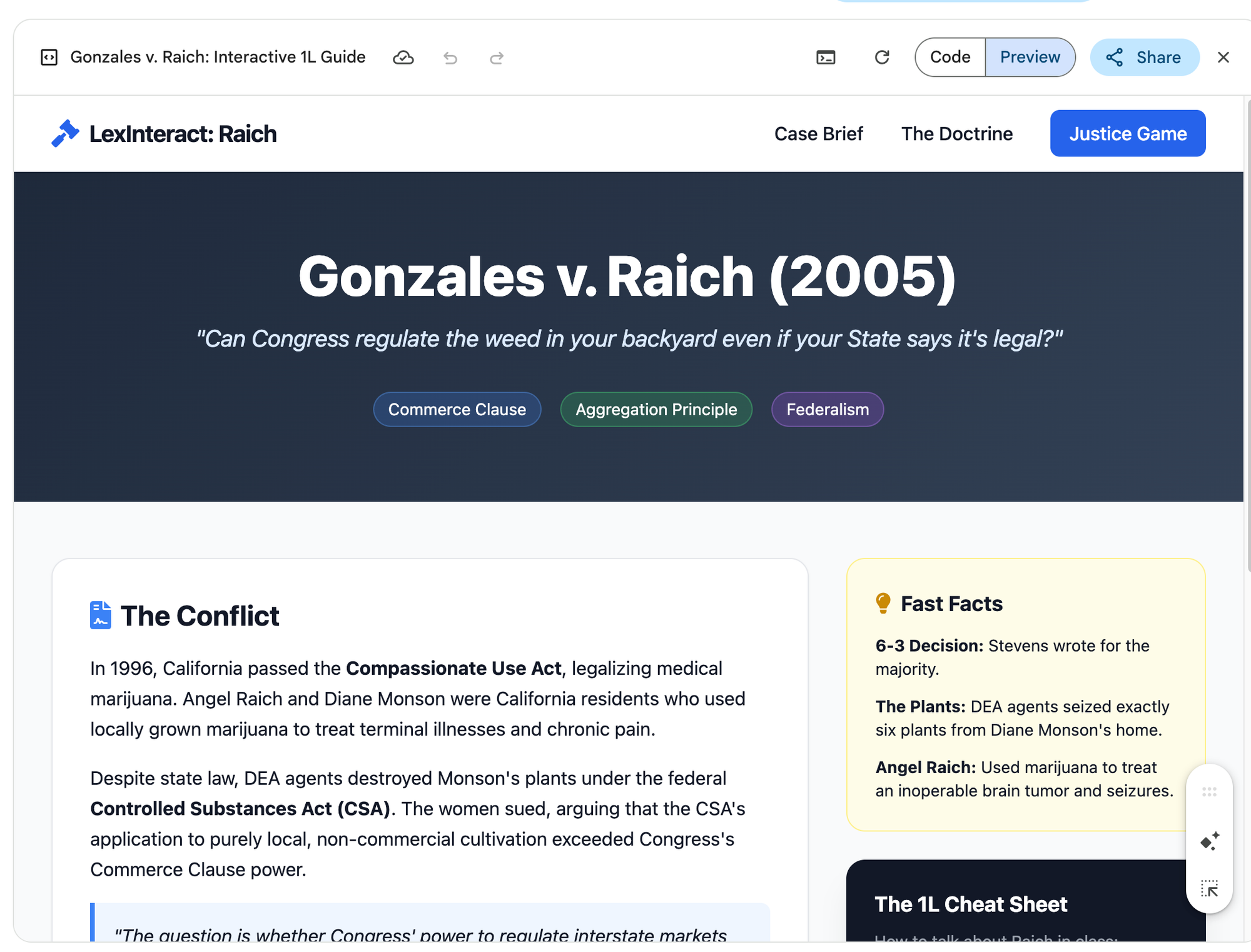 Moreover, by sharing the notebook you can let anyone with appropriate permissions generate materials from its contents. Here, for example, one of us (the author who dislikes dark mode) generates an interactive website on Gonzales v. Raich from the notebook that other author created.