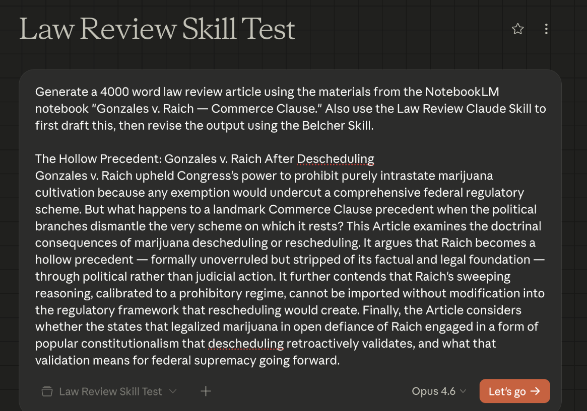 But we can do even better by harnessing Claude's extra powers. Here, as before, we ask it to use create a draft law review article involving Raich and to rely on the NotebookLM notebook for grounding but also ask it to use two Claude skills, one drafted by each blog author. We use a law review article drafting skill created by Ms. Swaab and the Belcher-proofing skill authored by Professor Chandler to reduce the incidence of bad AI writing.