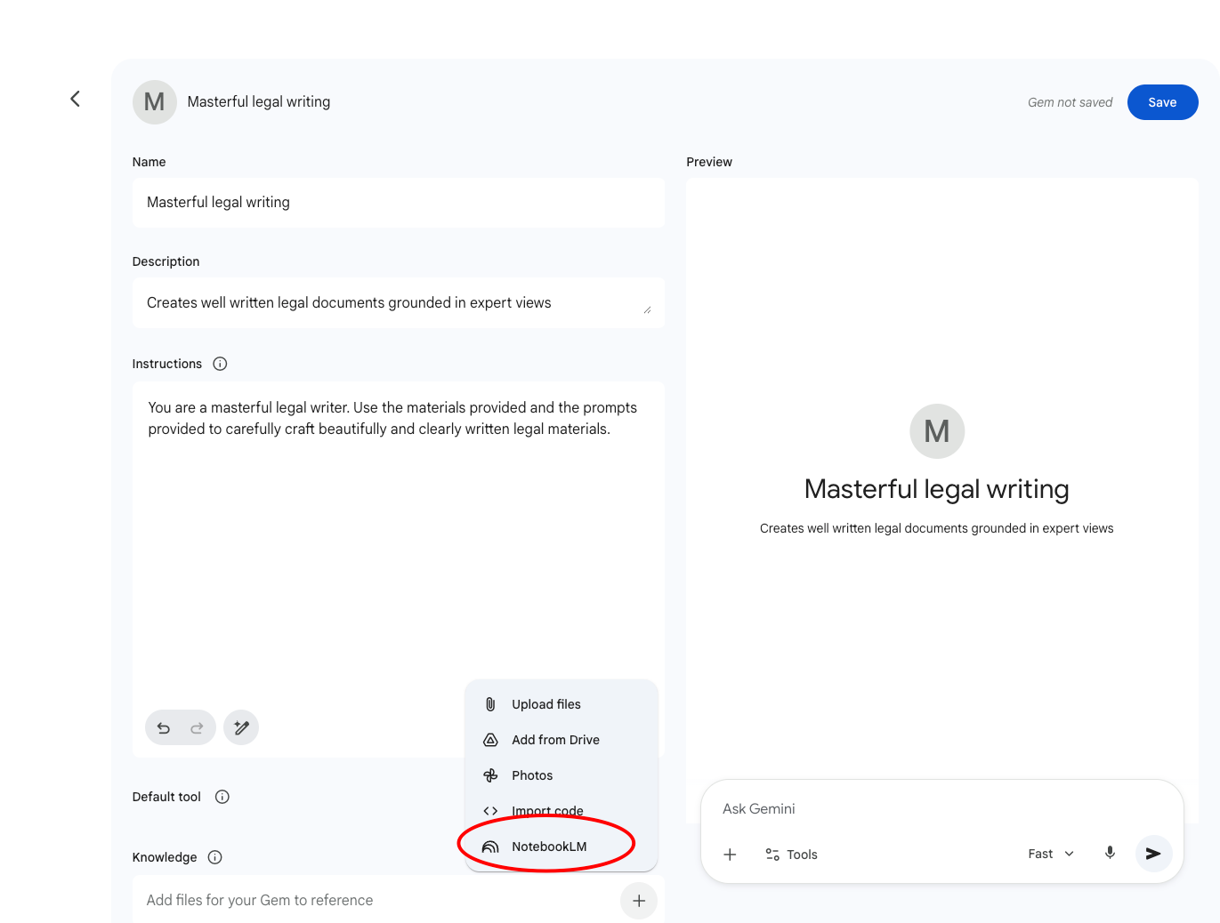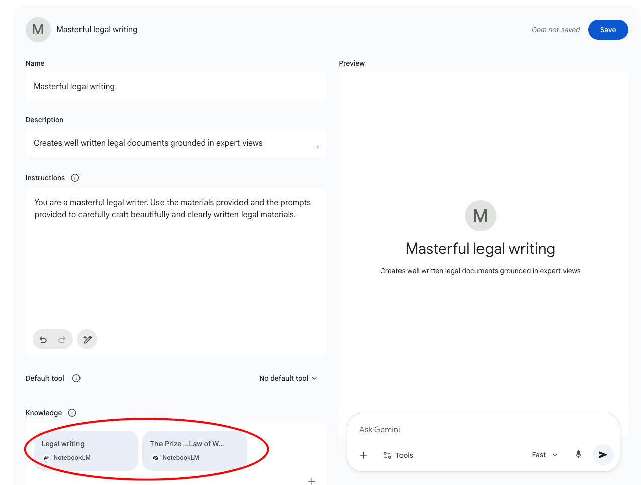 And because a Gem can connect to multiple NotebookLM documents, you can supplement its newly found knowledge with material on a substantive topic of interest. Here, for example, I create a specialized Gem that not only attaches to the Legal Writing notebook but also one on presidential war powers.