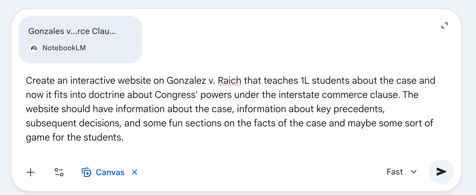 Canvas lets you turn a NotebookLM notebook into an interactive website or other dynamic output. To get started, open Gemini and locate "Notebooks" in the left side panel (you will need a current version of Gemini with the notebooks feature enabled). From there, you can connect to a NotebookLM notebook you previously created — for instance, the Gonzales v. Raich notebook we described above.