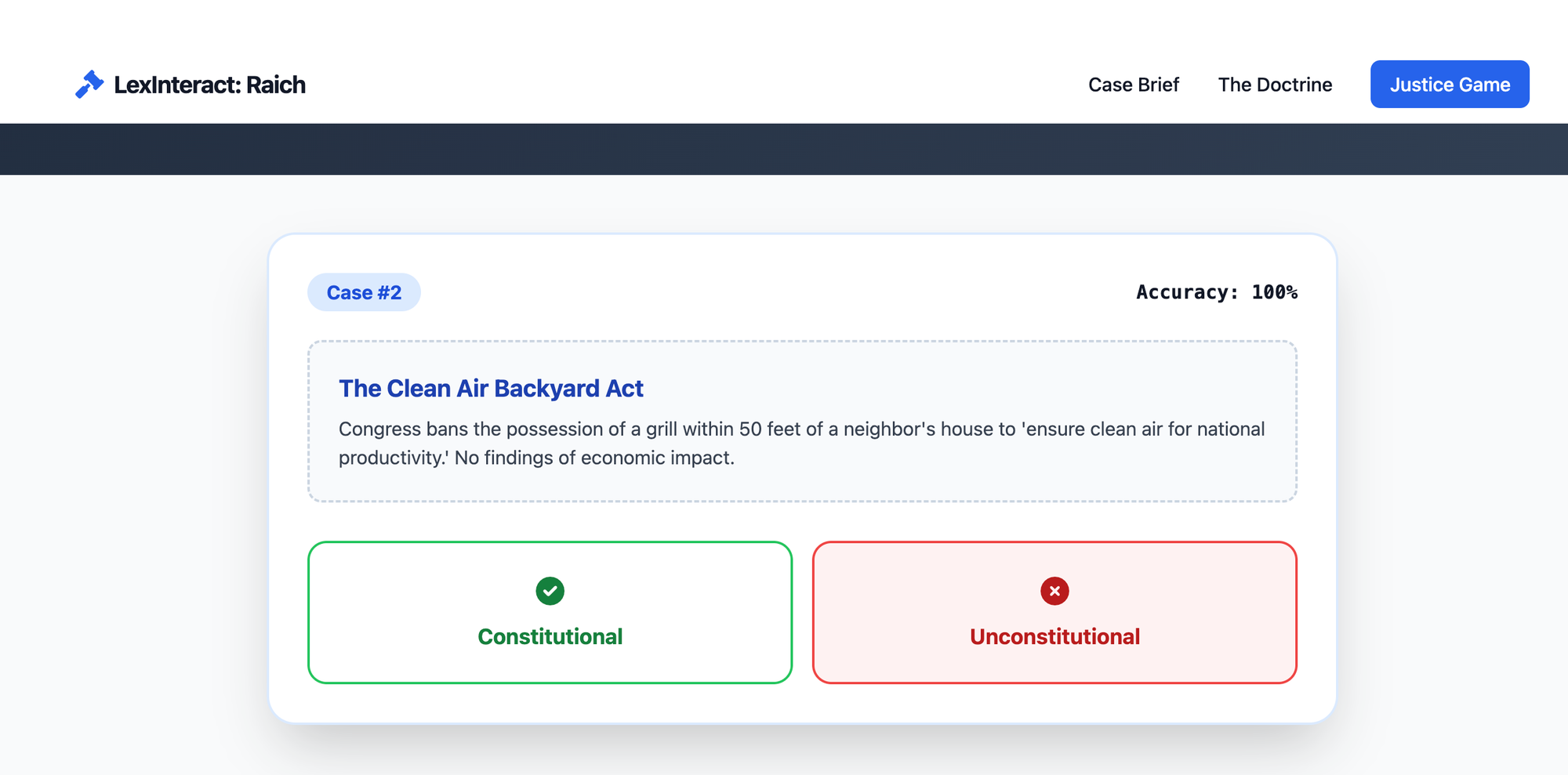 With a single click of the "Share" button, we can make the website available to the world at large. Here's its "Justice Game" in action sitting on that public website. (Hope you remember United States v. Lopez!)