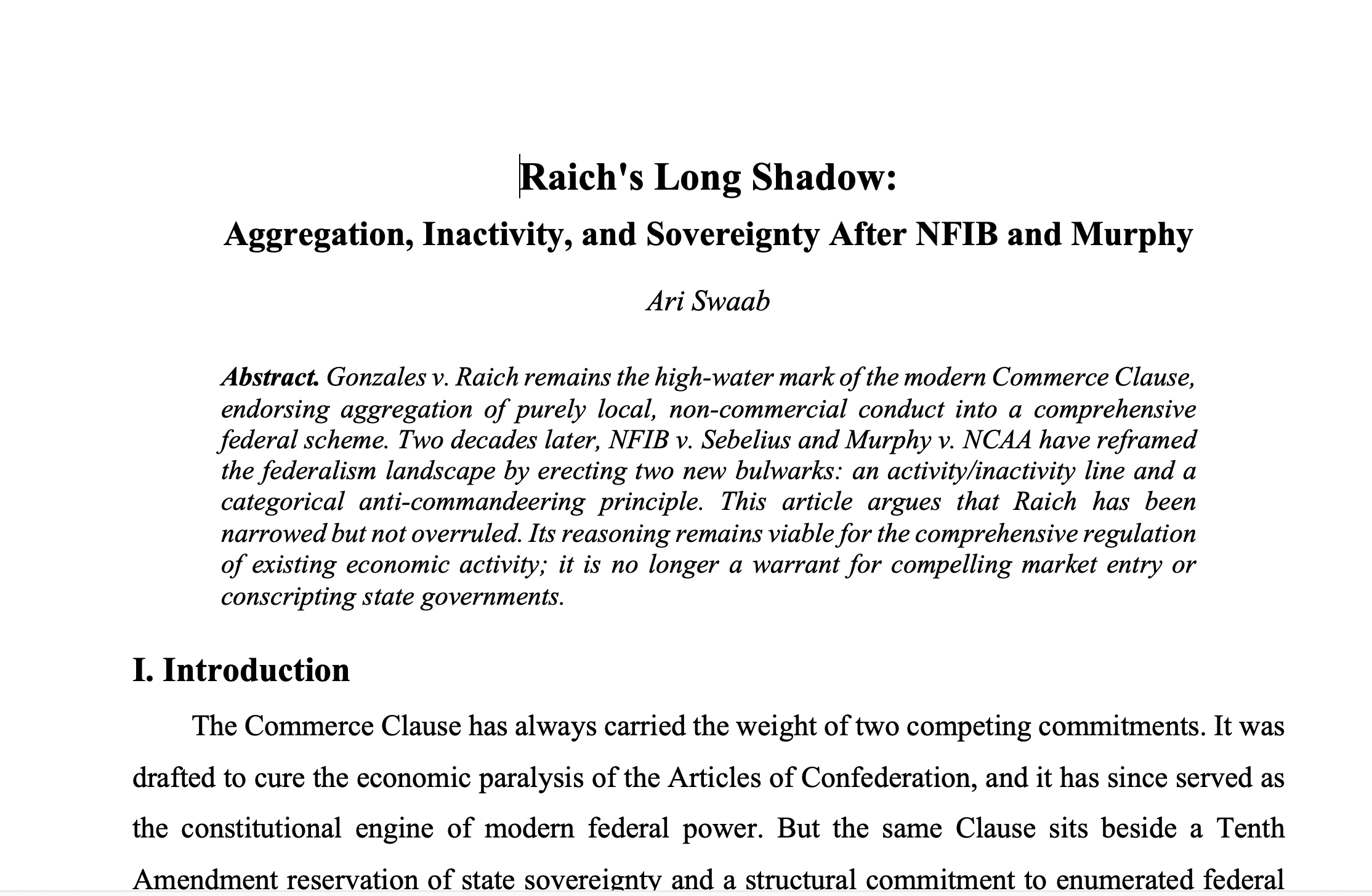 Use the sources and artifacts from the NotebookLM notebook "Gonzales v. Raich — Commerce Clause" to produce a 2000 word law review article draft analyzing how the Court's expansive interpretation of the Commerce Clause in Gonzales v. Raich compares to its more limited view in recent cases like NFIB v. Sebelius and Murphy v. NCAA. Does Raich's broad federal power over local economic activity still hold, or has the Court shifted to a more restrictive approach to the Commerce Clause? Discuss whether Raich's reasoning is still viable in light of these more recent precedents.