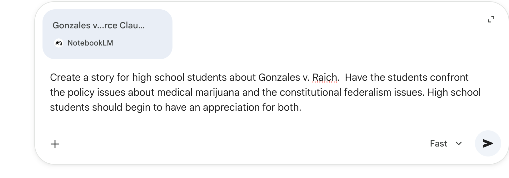 You can likewise use Gemini to create a "Guided Learning" session about the material in the NotebookLM. You could, for example, tell Gemini to create a Guided Learning session that would let you reenact the role of the lawyers for the United States (Gonzales) and for Raich and rehearse the arguments they would have had to make to the court.