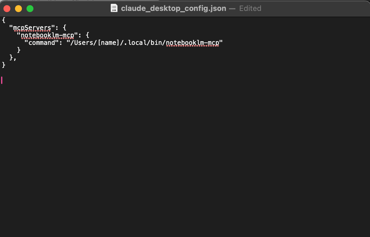 which notebooklm-mcpCopy the full path it returns. Then open your Claude desktop configuration file, which you can do programmatically: