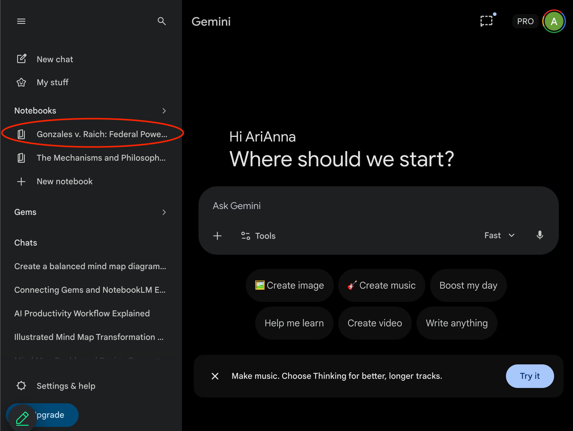 Gemini can now interrogate the sources in a NotebookLM notebook much the same way you would interrogate those sources inside NotebookLM itself. Consider a notebook containing sources on the 2005 Supreme Court decision in Gonzales v. Raich — the case in which the Court upheld Congress's power under the Commerce Clause to regulate homegrown marijuana even where a state had legalized it for certain purposes. Inside NotebookLM, you could ask for a report on why the Raich respondents might have believed California's legalization of homegrown marijuana for medical use should limit Congress's constitutional powers. With the new integration, you can obtain essentially the same report by querying the notebook from Gemini directly, without reopening NotebookLM at all.