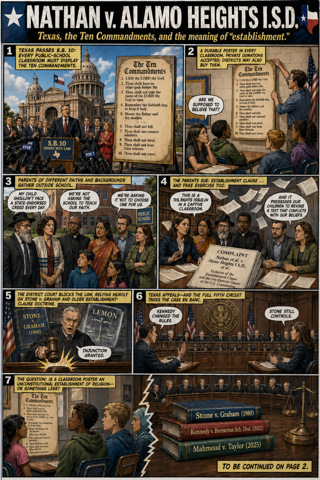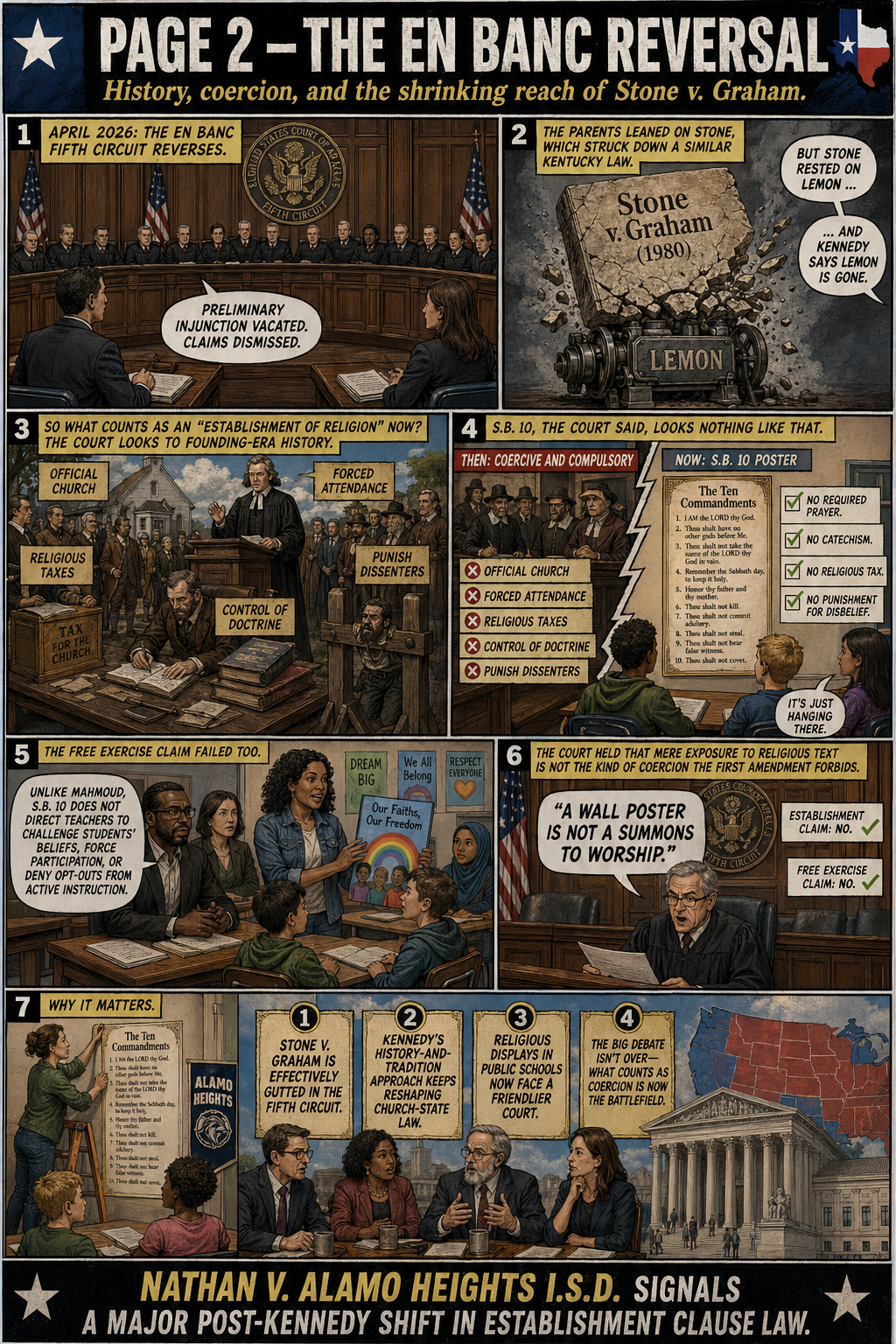 The new image generation capabilities go beyond comic books, however. They are also great for "infographics." Here's a two-image explainer of the Fifth Circuit en banc's latest decision in Nathan v. Alamo Heights I.S.D. on the Establishment Clause, in which a 9-8 majority finds no constitutional problem with Texas requiring public schools to put posters of the King James version of the Ten Commandments in every classroom.