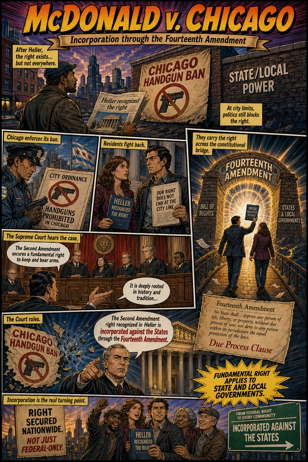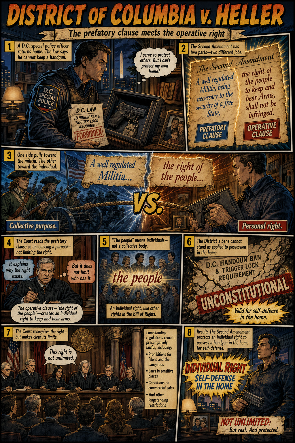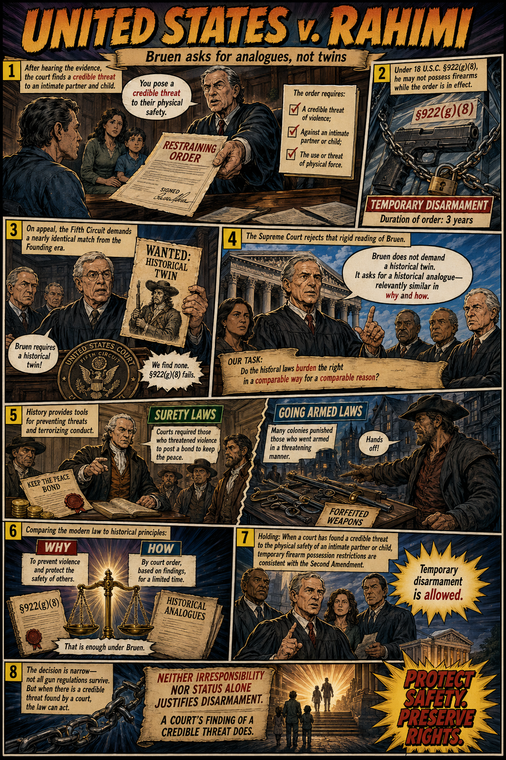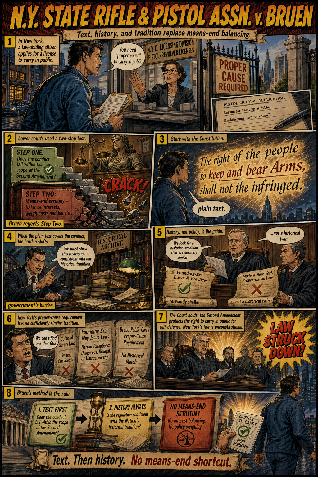 The fact that the technique works technically does not mean, of course, that it works pedagogically. I'm going to test that latter issue next week. As we have hit the end of the semester, I have to teach the Second Amendment in a single class. I'm going to try to generate the Heller, McDonald, Bruen, Rahimi sequence with comic book illustrations. I'll amend this posting after I see whether the students love it, regard it as an interesting novelty (to be repeated infrequently), or prefer my classic PowerPoints. In the meantime, however, I would urge those in legal education to take advantage of these new image generation models and think of new ways to engage with students in media at least many of them enjoy.