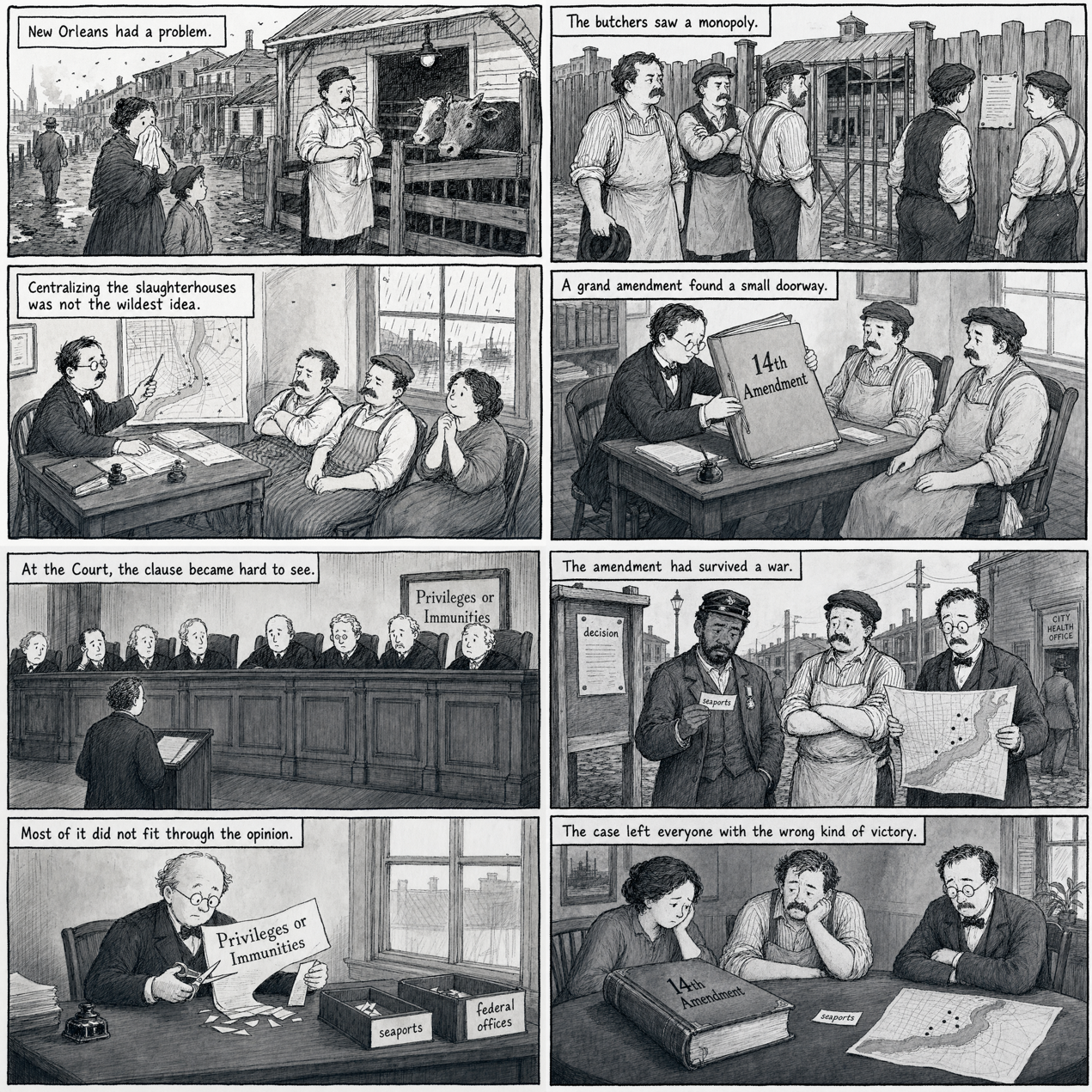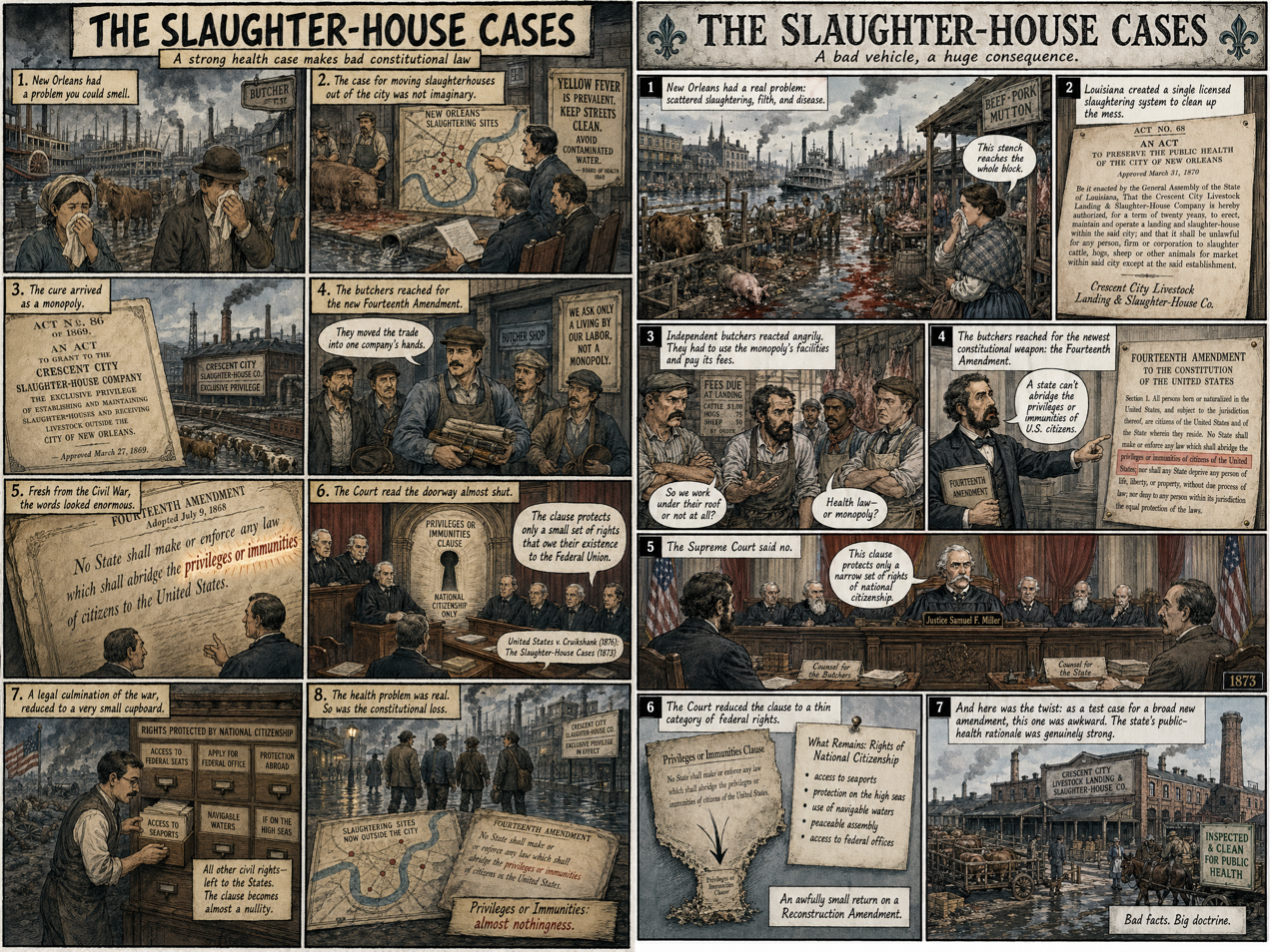 I want you to create a comic book strip on The Slaughter House cases. There should be some cynicism because the decision ends up converting the privileges or immunities clause of the 14th amendment into almost nothingness. If one views that amendment as the legal culmination of the civil war, the decision suggests – absurdly – that we fought the civil war to prevent states from depriving us citizens of access to seaports. Also, stress that this is a terrible test case for the 14th amendment, the case for improving public health in steamy, fever-laden New Orleans was pretty strong. Don't preach though. Hint.