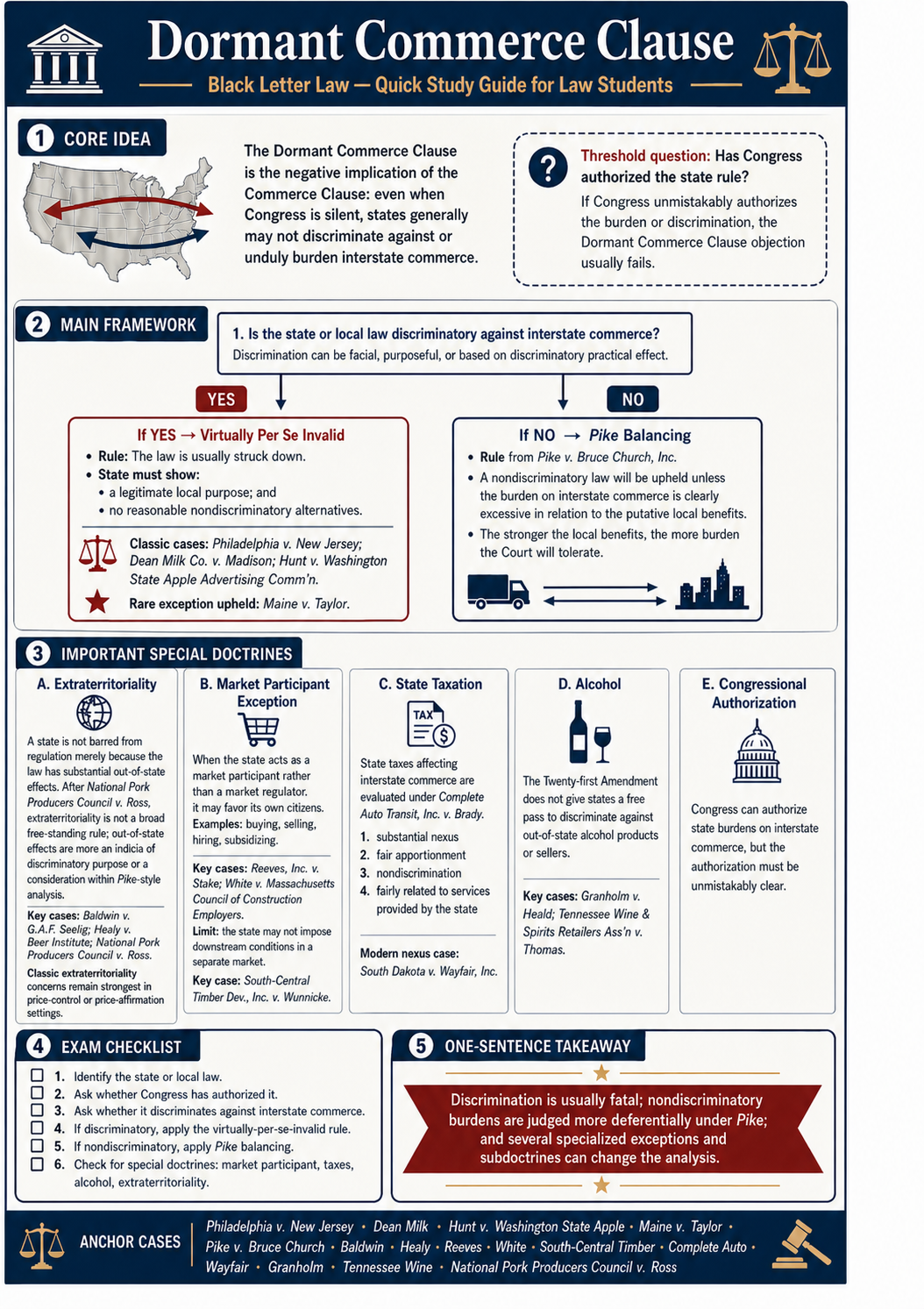 And here's one on the black-letter of law of the Dormant Commerce Clause. The prompt was simple: "Create an infographic for law students on the black -letter law of the Dormant Commerce Clause." When the resulting infographic neglected the recent case of National Council of Pork Producers v. Ross, I helped it along by saying, "You need to edit part 3A to take account of National Council of Pork Producers v. Ross, which sees extraterritoriality more as an indicia of intent. And add Ross to the list of anchor cases. Otherwise keep it the same."