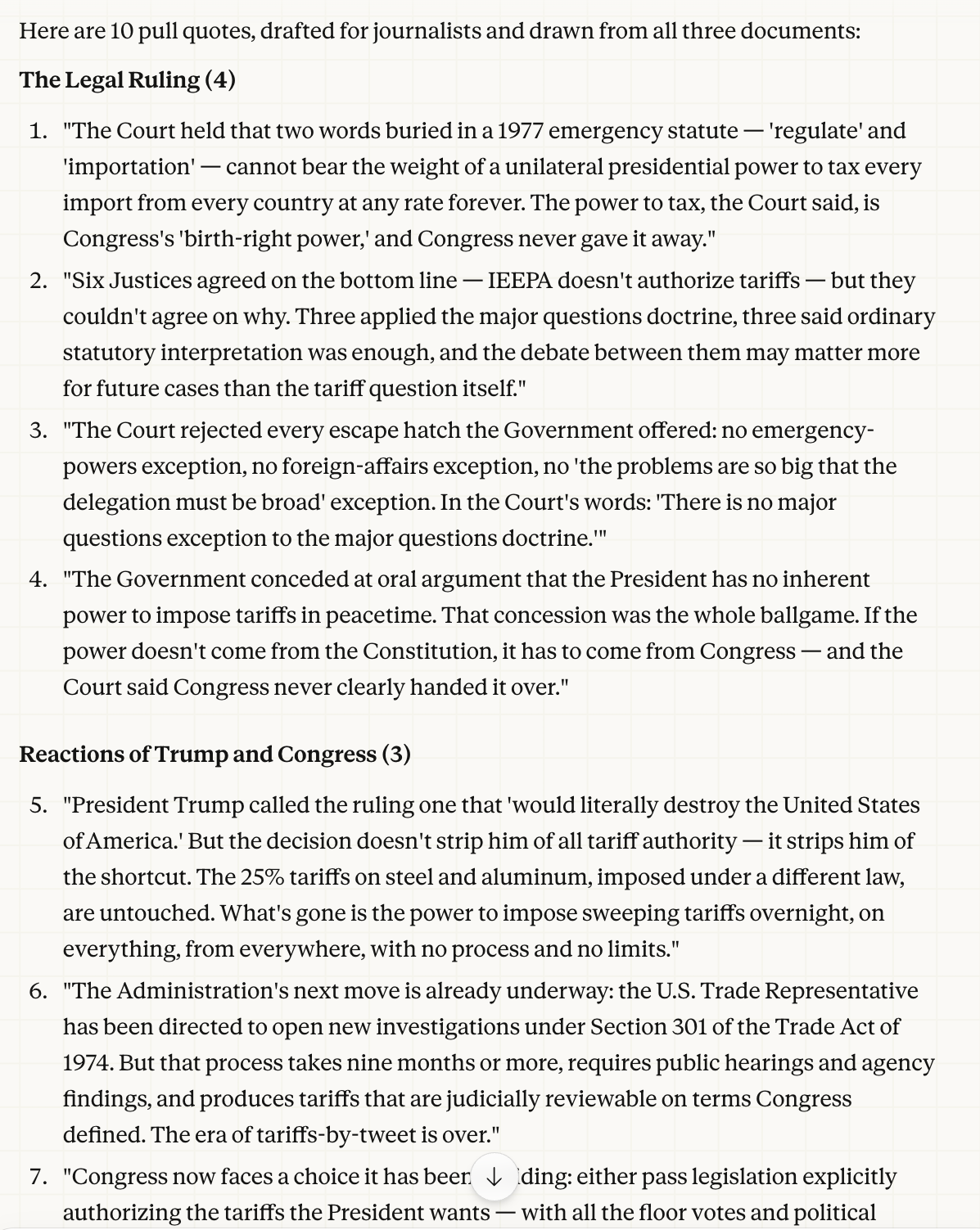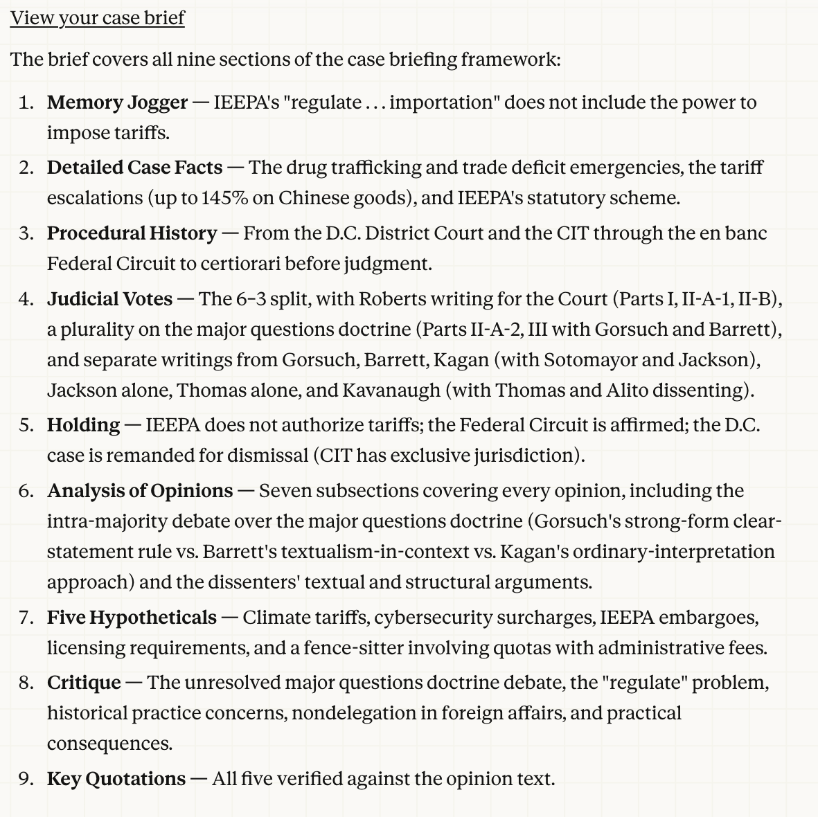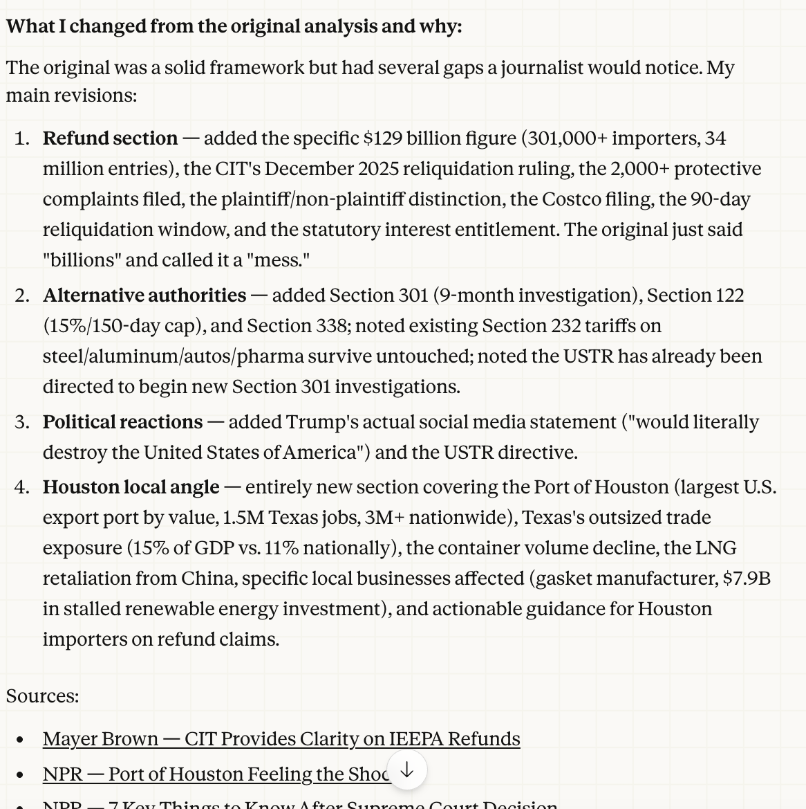 Since Claude was kind of busy and I had been contacted by the Houston Public media outlet for my views on the case, I then fed another AI (Gemini) a request to read the opinion and focus on its practical implications, with attention to "the local angle." Houston imports a lot of tariffed goods. I then fed Gemini's output back into Claude and asked it to review and revise the work. It then responded with the following comments and a Word document.