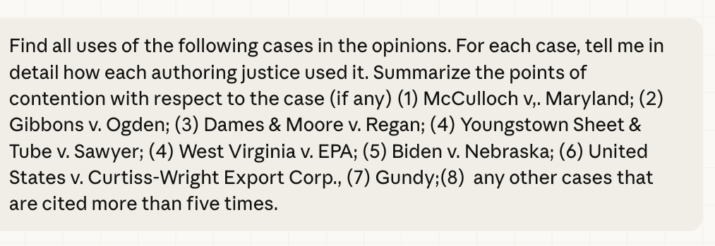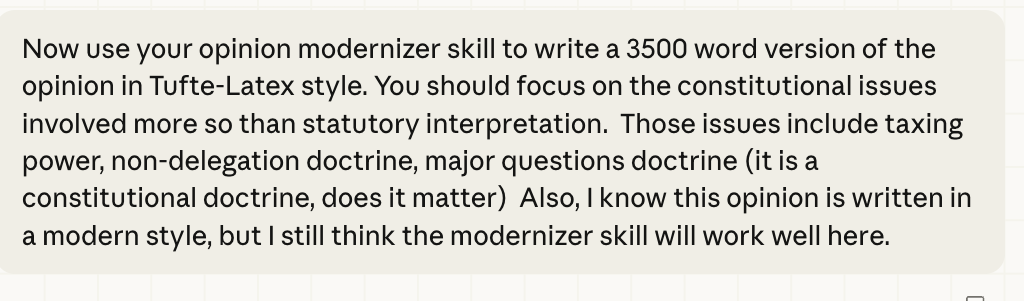 I then asked Claude to produce a "modernized" version of the opinion in what I call "Tufte-Latex" form using a pre-baked skill. My idea was that I could give this excerpted version of the case to my class this week, which, as it happens, was studying the major questions doctrine and the non-delegation doctrine, both of which form important parts of Learning Resources v. Trump.x`