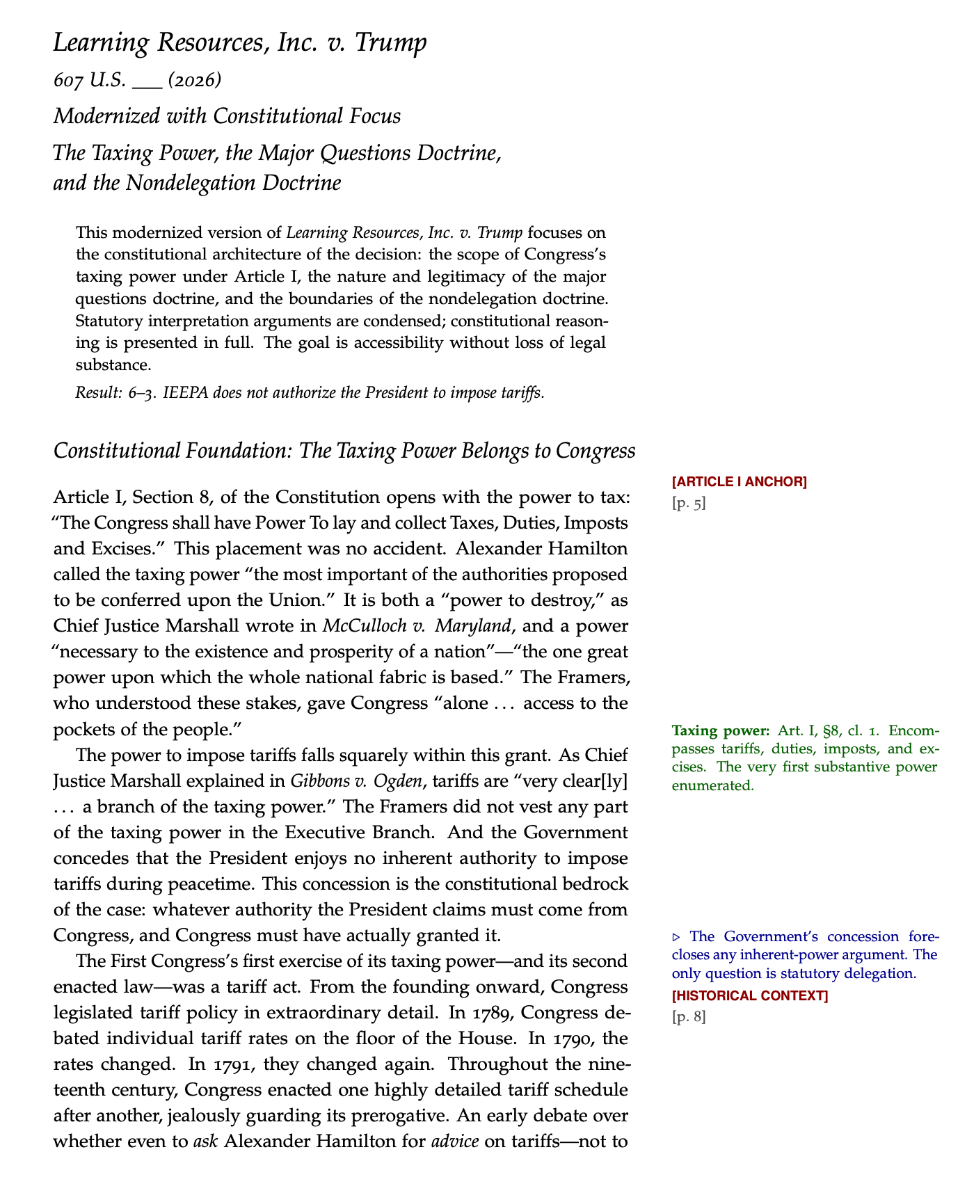 In any event, the case confirms a structural principle that the Framers would have recognized: the power to tax — including the power to impose tariffs — belongs to Congress. A President who wishes to exercise that power must find it stated in terms that Congress would recognize as a delegation of its most consequential authority. Two words buried in a 1977 emergency statute are not enough.