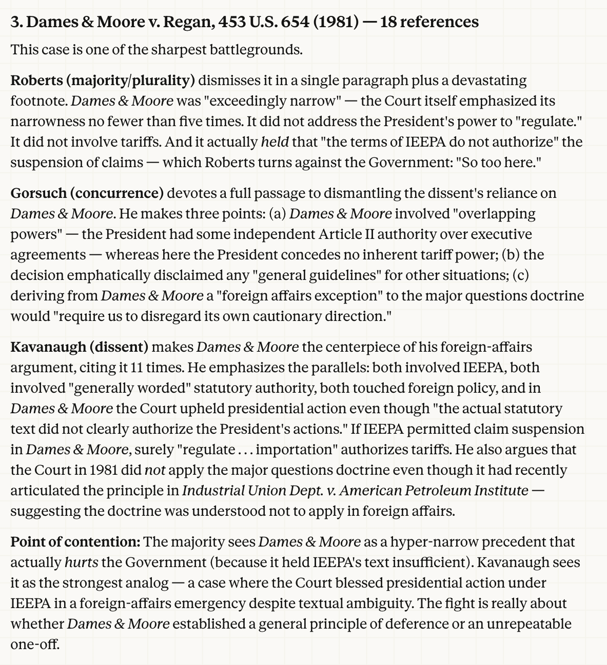 This Comment also argues that the opinion's treatment of foreign affairs precedent — in particular, its narrow reading of Curtiss-Wright and its recharacterization of Dames & Moore — may prove more durable and more consequential than the major questions analysis that attracted more attention. These precedential moves were accomplished within the textual holding that all six majority Justices joined, giving them stronger institutional support than the plurality's constitutional overlay. And they address a dimension of executive power — the claim to special deference in foreign affairs — that extends well beyond the tariff context.