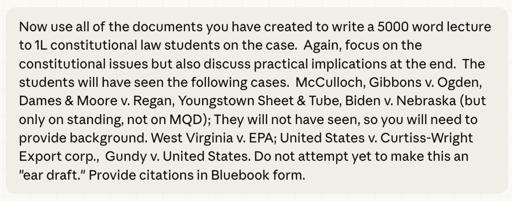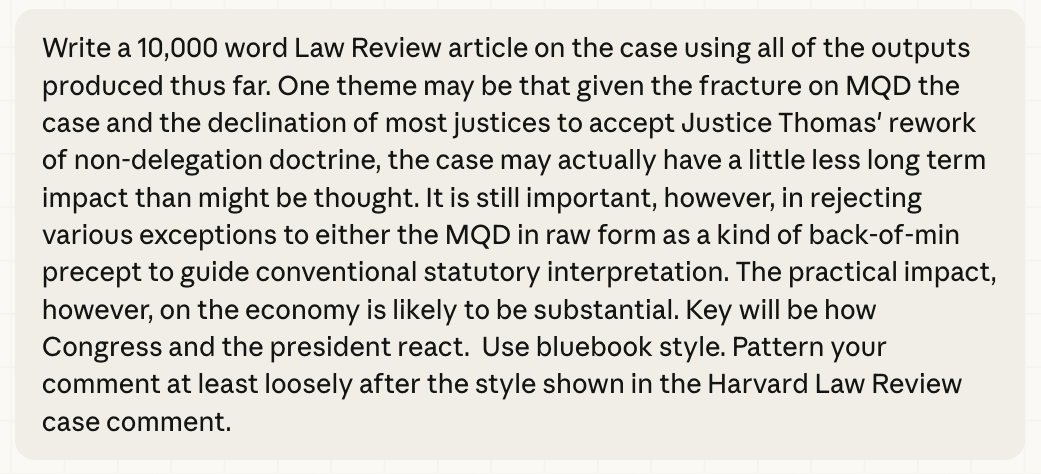 And now I got ambitious. I fed it a well-written Case Comment from the Harvard Law Review (thank you, Professor Kate Redburn) and provided the prompt below. It is not false humility to suggest that the degree of human insight provided to Claude was minimal.
