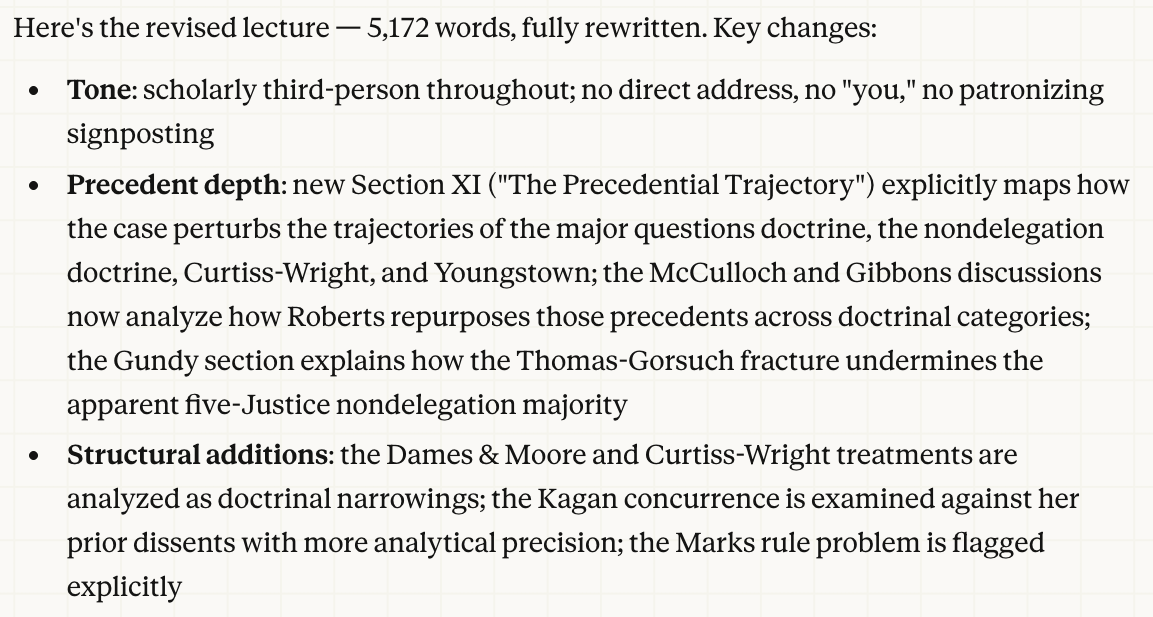 I want to tell you all that it took at produce a 15,000-word article on Learning Resources v. Trump, the tariffs case decided yesterday by the Supreme Court. The entire process took about two hours, during most of which I could clean the kitchen as Claude Cowork toiled in the scholarly fields. It relied heavily on what I described in a prior blog entry as The Killer App, combining agentic AI (Claude Cowork) with a great model (Opus 4.6) with a connector (Midpage AI MCP) with a legal database (Midpage AI). If you want to see the results and defer examining the process, just go to the bottom of this entry and read the article. Alternatively, go to this link to read the result as a Microsoft Word (docx) file. But here first is a screenshot of what Claude could produce and then a description of what it took to let AI produce what sure looks like a bona fide law review article.