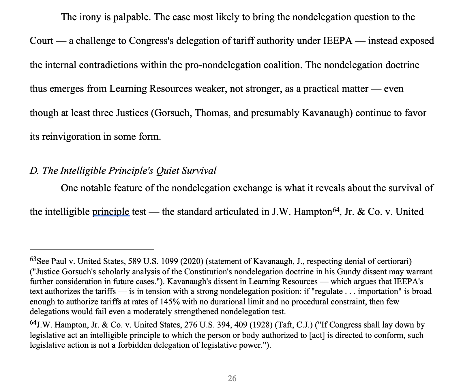The intelligible principle test thus survives Learning Resources intact, if somewhat awkwardly. It was not discussed, not applied, and not replaced. The Justices who would like to strengthen it cannot agree on how, and the Justices who would like to abandon it were not called upon to defend it. The test remains the law — not because anyone affirmatively endorsed it, but because no coalition could form around an alternative. For practitioners advising clients on the validity of congressional delegations, this quiet survival may be the most practically significant nondelegation development in the case.