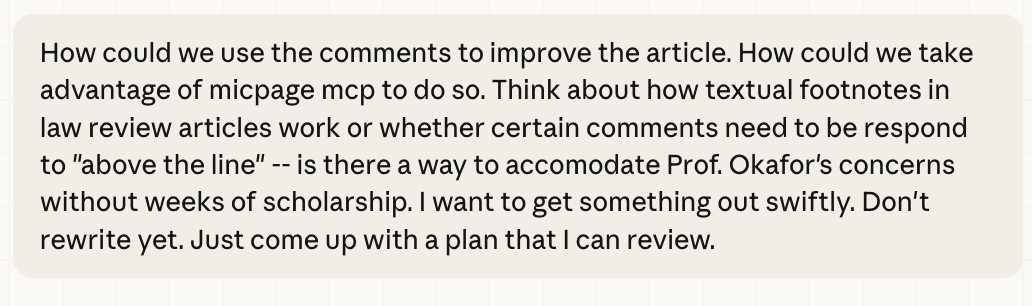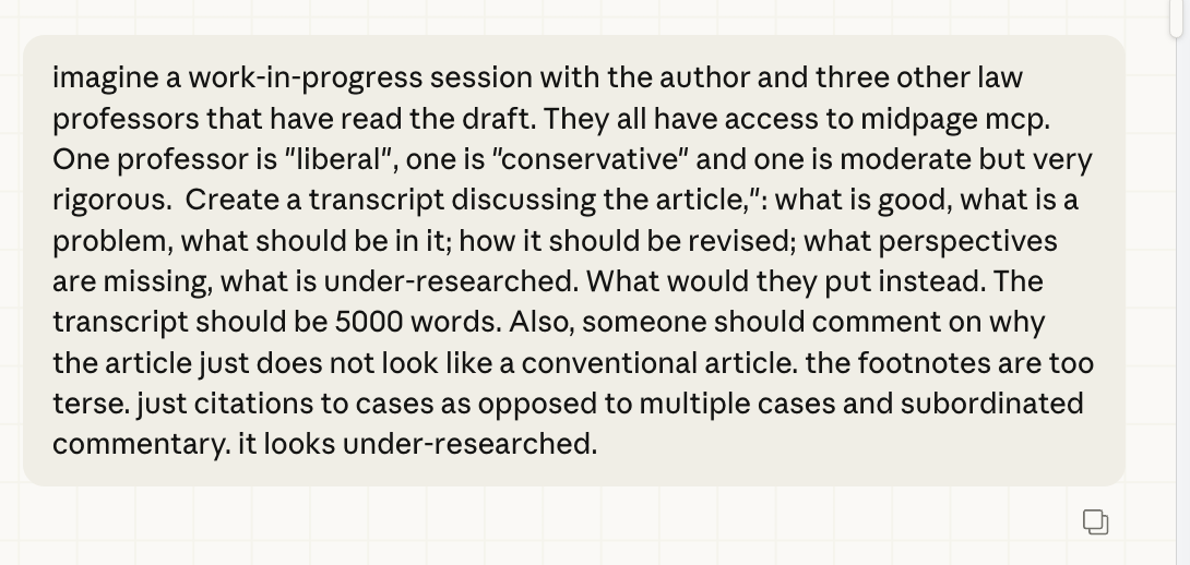 I haven not yet evaluated this article for hallucinations. I have not yet submitted to other AIs or humans for evaluation. We need a rigorous evaluation skill, which takes the draft and goes through it carefully footnote by footnote, argument by argument. But my initial read suggests that it pretty darned good. And I am optimistic that an AI grounded in a legal database could do well on that final phase. Your feedback welcome.