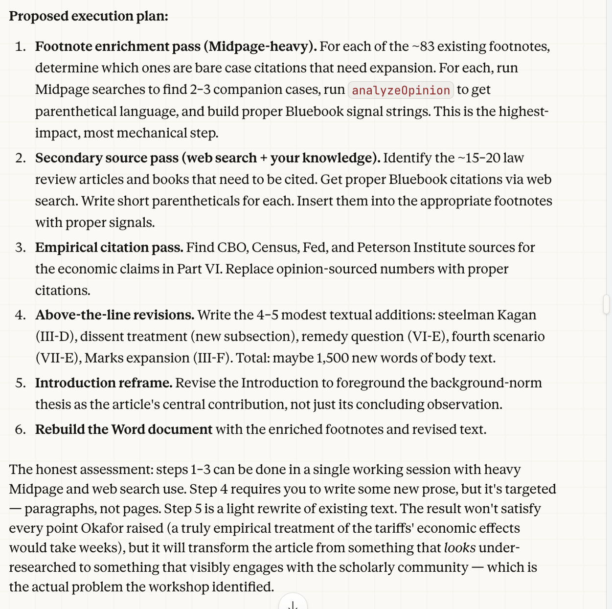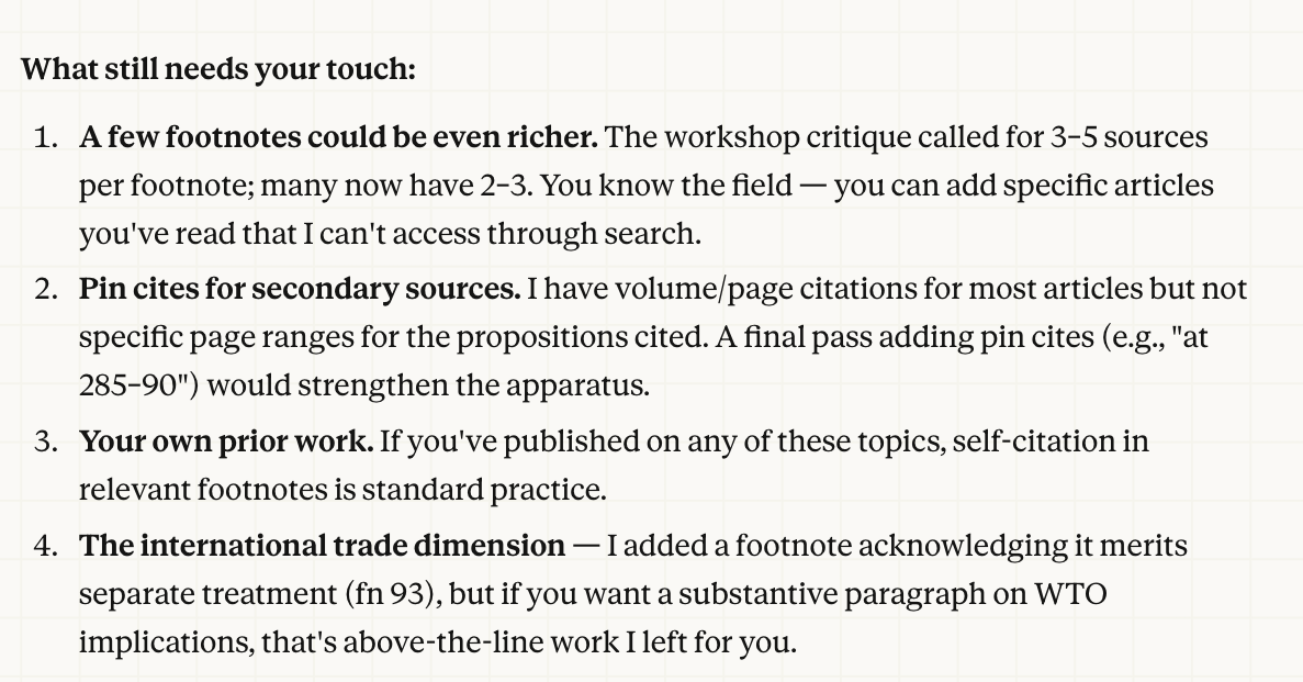 Claude's first effort was not great. The article didn't have footnotes; an absence that would be fatal to any attempt at respectable publication. A corrective, however, produced something usable, though it still just did not quite look like a law review article. I then put the draft article through a synthetic "Word In Progress" seminar.