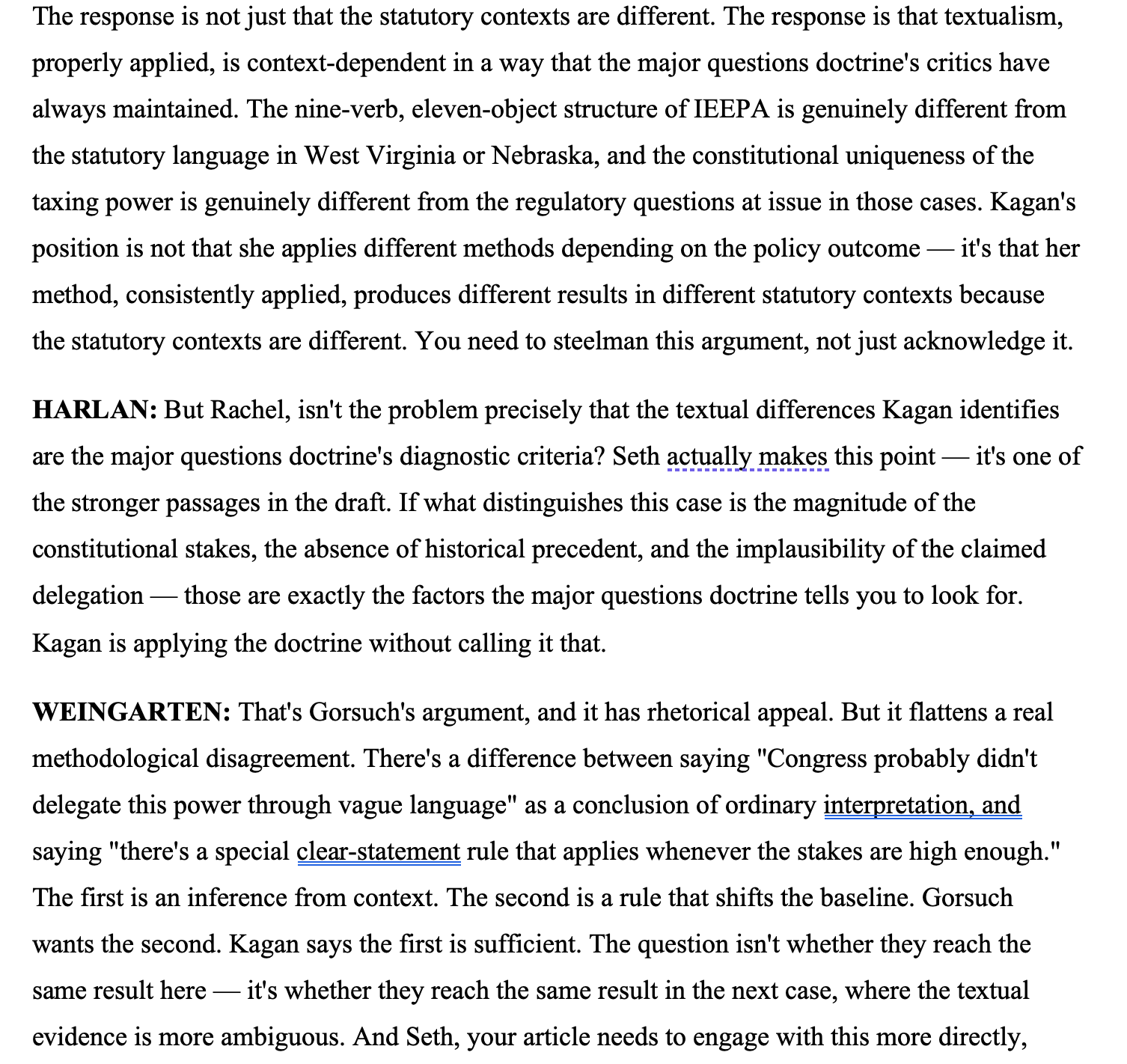 There is, however, a response available to Kagan, and it deserves more development than its surface simplicity might suggest. The statutory contexts are genuinely different — not merely in degree but in kind. IEEPA's nine-verb, eleven-object structure; the constitutional uniqueness of the taxing power; the complete absence of any reference to "duties," "tariffs," or revenue; the Export Clause problem — these features may distinguish this case from the prior major questions cases without any need for a heightened clear-statement requirement. More fundamentally, Kagan's position rests on a methodological commitment that textualism, properly applied, is context-dependent in a way that the major questions doctrine's proponents have resisted acknowledging. On this view, statutory interpretation always involves reading words in their full legal and constitutional context, and the interpretive weight of that context varies with the nature of the power claimed. The taxing power occupies a unique position in the constitutional structure — it is the first enumerated power, the subject of specific procedural requirements, and the historical catalyst for the Revolution itself. A textualist who reads "regulate . . . importation" in light of that constitutional background is not applying a special rule; she is doing what textualists always do, which is to read text in context. The fact that context produces different results in different cases is not evidence of inconsistency but of the method working as intended. If so, then the textual holding in Part II-B does the work, and the major questions analysis in Part II-A-2 is, as Kagan contends, surplusage.
