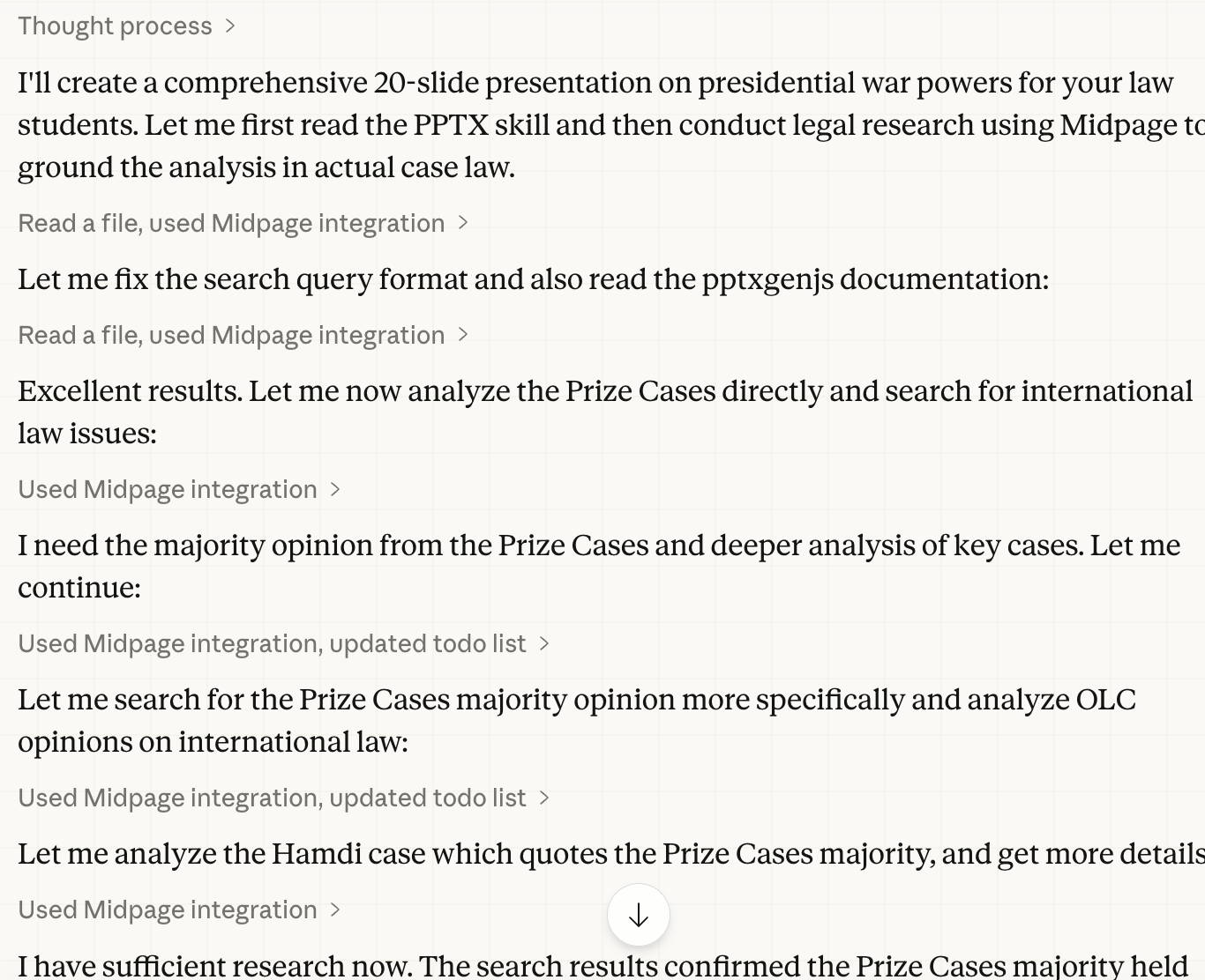 I wanted to have a canned presentation ready to go for my constitutional law class in the event of an American military intervention in Iran. To be sure, I could have had a discussion about the legal aspects of that contingency with any respectable AI; with a little guidance from me ("Here's the Prize Cases", "Consider this document asserting the War Powers Act is unconstitutional", "Create a beamer presentation of 20 slides based on the dialog we have had thus far"), I'm sure we could have generated something decent. Instead, however, I launched Claude Cowork with the Midpage AI MCP active and just asked the following: