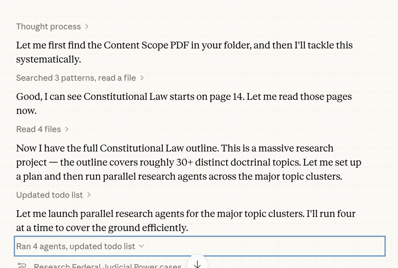 Third—and this one is particularly interesting—I developed an issue-spotting problem involving the independent and adequate state grounds doctrine. I gave the problem first to a high-powered AI that did not have access to grounded legal data. That AI blew it. It charged ahead declaring that of course the victim of an unwarranted search had constitutional rights, without ever considering whether a state law issue in the state supreme court opinion might defeat Supreme Court jurisdiction altogether. So I gave the same problem to Claude Cowork with Midpage connected, and simply said: write a lawyerly answer to this problem, think hard, it contains a crucial issue that another AI completely missed. I did not point it to Michigan v. Long or any other material on the independent and adequate state grounds theory. Claude Cowork found the issue on its own. It returned a grounded answer citing older cases that were not entirely familiar to me—including Murdock v. City of Memphis from 1875, which it identified as central. When I opened that case in Midpage, I found it was going to be a slog. So I asked Claude Cowork to use a skill I had built—an opinion modernizer—to make it lucid. It did. And then it went further. It produced a short law-review-style document exploring the different treatment of related state claims in federal trial courts versus the Supreme Court. It titled it “Questions, Not Cases: The Asymmetric Power of Federal Courts to Decide State Law.” Yale isn't accepting it, but it does contain genuine insight—a researched and grounded amplification of a small spark I provided.