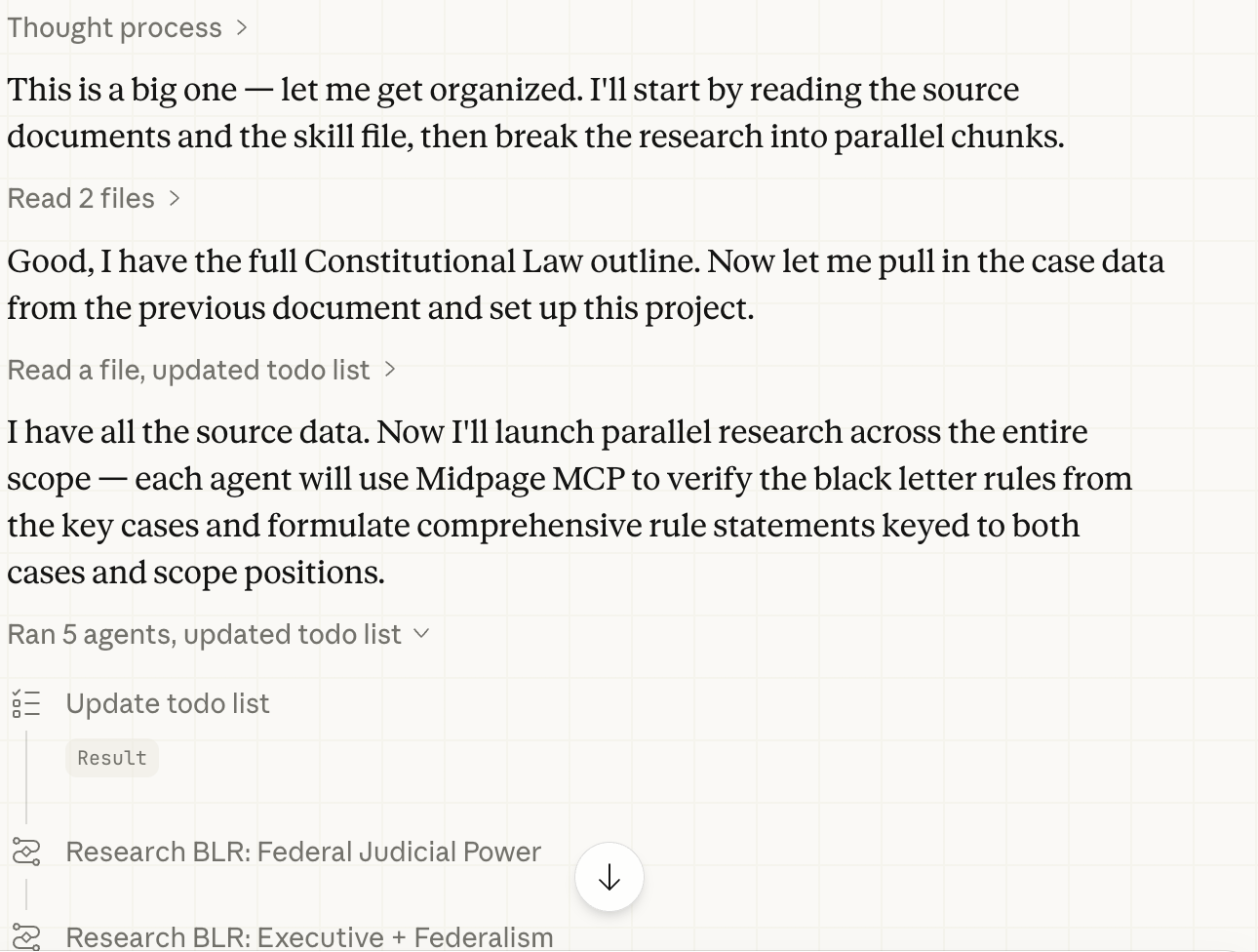 Fourth, the NextGen bar exam. I fed Claude Cowork the public materials on constructed-response questions for the NextGen exam along with an outline of the areas of law the test might cover—what they call the content scope. I asked it to use Midpage to compile all the cases a student would need to know, then to generate black-letter rules keyed to those cases, and finally to create a reusable Claude skill that generates NextGen-style constructed-response questions with answers and grading rubrics—all grounded in full-text case law via Midpage. Claude Cowork created a set of research agents, each with access to the Midpage connector. The research took several minutes—this is not a workflow for the impatient—but the result was a twenty-one-page case reference document, a twenty-two-page rules document, and a working skill. The smart thing to do would be to equivocate and say preliminary results are encouraging. But that wouldn't be true. Preliminary results are spectacular.