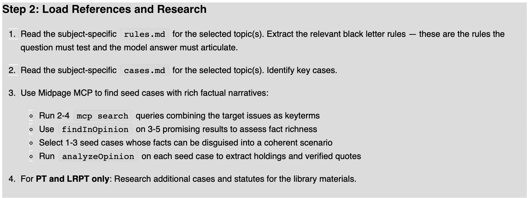 analyzeOpinion is the heavy hitter. Claude sends a case and a legal question to Midpage, and gets back structured analysis: what propositions the case actually supports (with verbatim quotes), the scope and limitations of each holding, whether it is a core holding or mere background, and, crucially, what the case does not address. This last feature is what prevents the kind of over-citation that gives AI-assisted legal research a bad name. Here's an example of the kind of instructions the analyzeOpinion tool contains. Again, with all respect to midpage, its instructions are well worked out, but they not the sort of protected works of genius it might be difficult for others to build on.