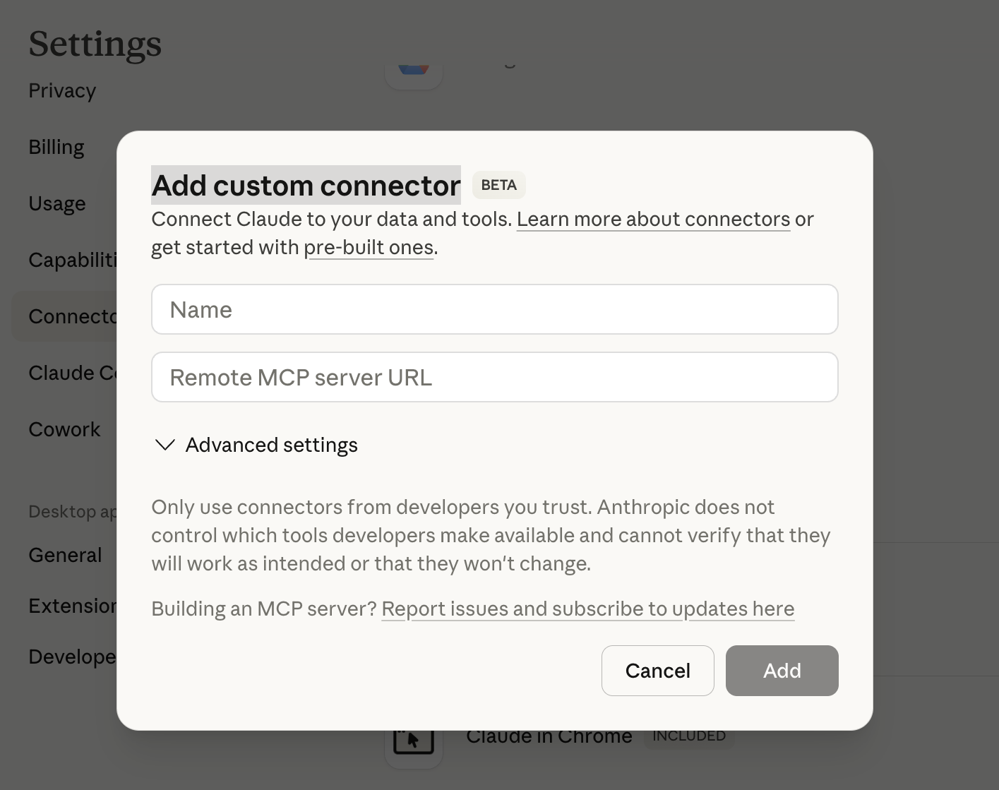 Hooking up a connector such as the Midpage MCP is likewise simple. You can do it by navigating to this page by pressing the "Add custom connector" button in the Connectors part of the settings page.