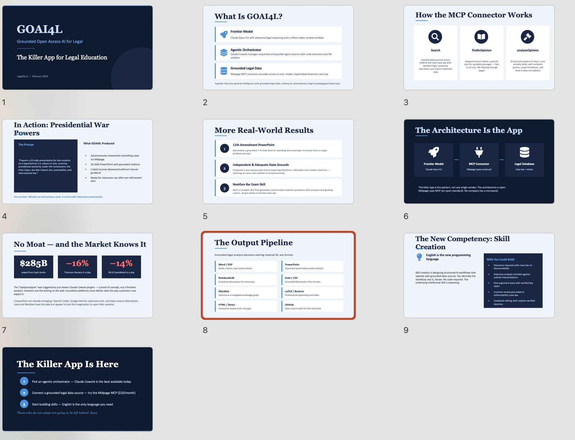 Something happened this past month that deserves more attention than it has gotten in the legal education world. Midpage released an MCP integration for Claude. That sentence probably means nothing to most law professors, so let me translate: a startup with a comprehensive case law database just gave Claude—Anthropic's large language model—direct access to real, citable, hyperlinked American case law. And it didn't just make the capability available to the Claude chatbot with which many in legal education have familiarized themselves over the past few years. It didn't just make that capability available to Claude's Opus version 4.6, a language model with a context window of one million tokens that is probably the best in the business right now at text-based reasoning. It made full text legal sources available to Claude Cowork, which can orchestrate numerous AI agents running Opus 4.6 sequentially or in parallel and having access to a panoply of tools, including code. In short, it created Grounded Open Access Artificial Intelligence for Legal (GOAI4L), the Killer App.