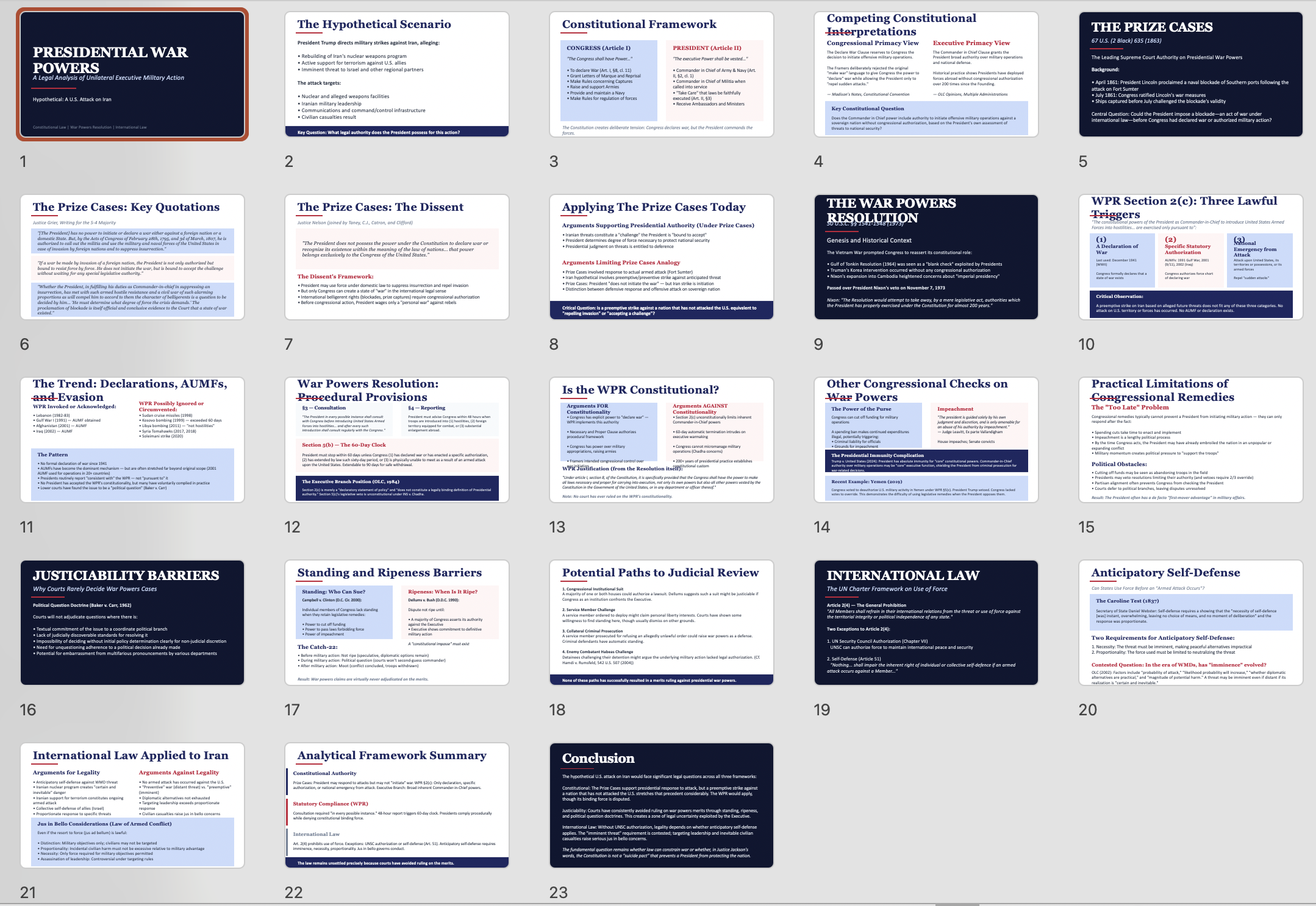 I want you to imagine that sometime in the next week President Trump directs an attack on Iran, alleging that they were rebuilding their nuclear weapons program and a terror network. He also alleges they were about to attack us allies such as Israel. Assume the attack goes beyond facilities alleged to have been involved in those activities and seeks to kill Iranian leadership as well as its communications and control. Inevitably, some civilians are killed I want you to prepare a slide show of 20 slides for law students on (a) the president's authority under the text of the constitution; (b) the relevance of the Prize cases; (c) the war powers act, including its genesis, and focusing on its provisions. (d) I need you to discuss theories of why the war powers act is constitutional and why it is unconstitutional and what various presidents have said about it. have they complied; have they volunteered even though they think it unconstitutional. Explain why it has been difficult to challenge in court (justiciability). How might the federal courts acquire jurisdiction over such a case. Then have three slides on international law regarding the hypothesized attack. The tone should be objective and professional but not pull punches where legal issues are clear. Use the midpage mcp to ground your responses as needed.