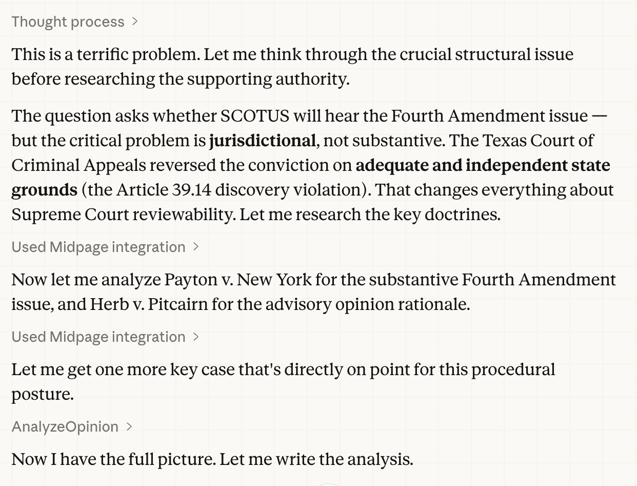 I developed with AI an issue spotting problem that required students to consider whether the independent and adequate state grounds theory precluded Supreme Court review of what appeared to be a substantive issue in constitutional law. A high powered AI that did not yet benefit from an ability to access legal material blew it when asked to analyze the hypothetical. It charged ahead, declaring that of course the victim of an unwarranted search had rights without ever considering whether a state law issue mentioned in the state supreme court opinion might defeat Supreme Court jurisdiction altogether. So I gave the problem instead to Claude Cowork buttressed with the Midpage MCP capability:
