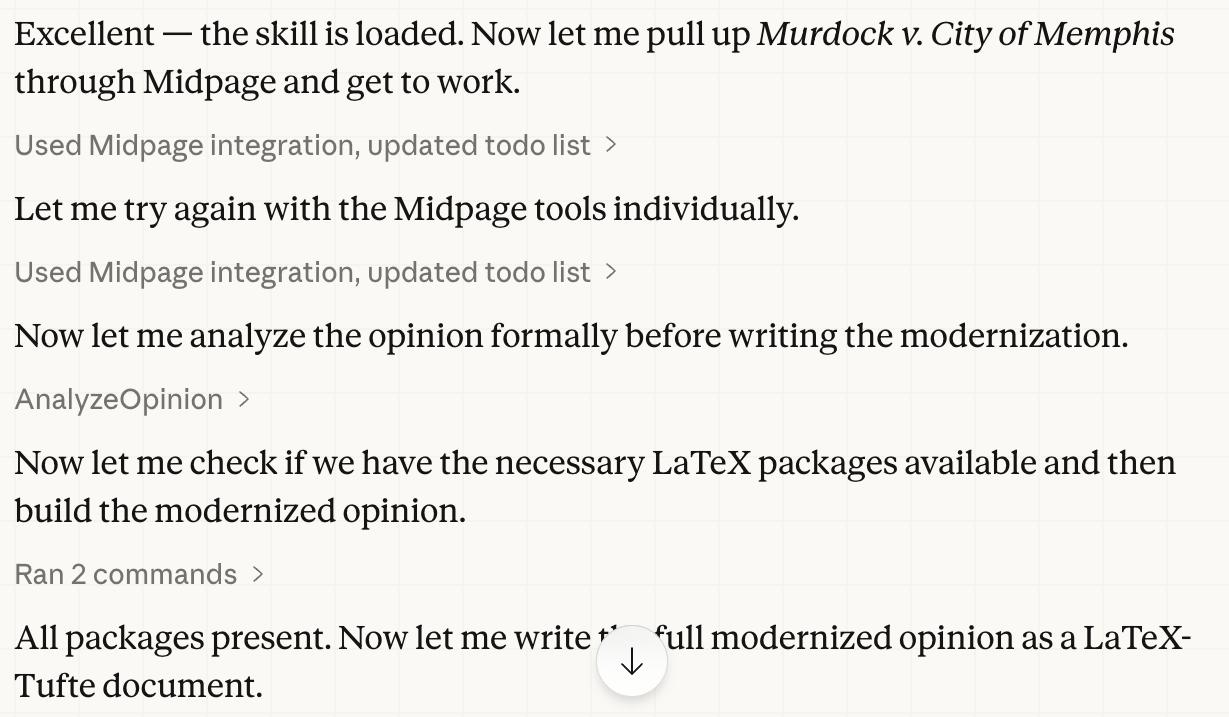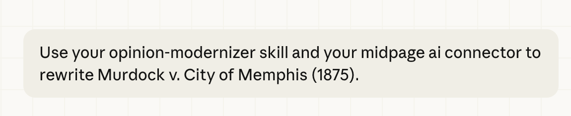 Claude Cowork returned commentary on the problem and a grounded answer with cites to older cases that were not entirely familiar to me. One of those cases, Murdock v. City of Memphis (1875), seemed central but when I opened it up in Midpage to human-read it, I found that it was going to be a slog. And, yes, law professors are well trained to deal with slog, but to accelerate matters, I asked AI for help. I could ask Claude Cowork to use a skill and make the opinion more lucid.
