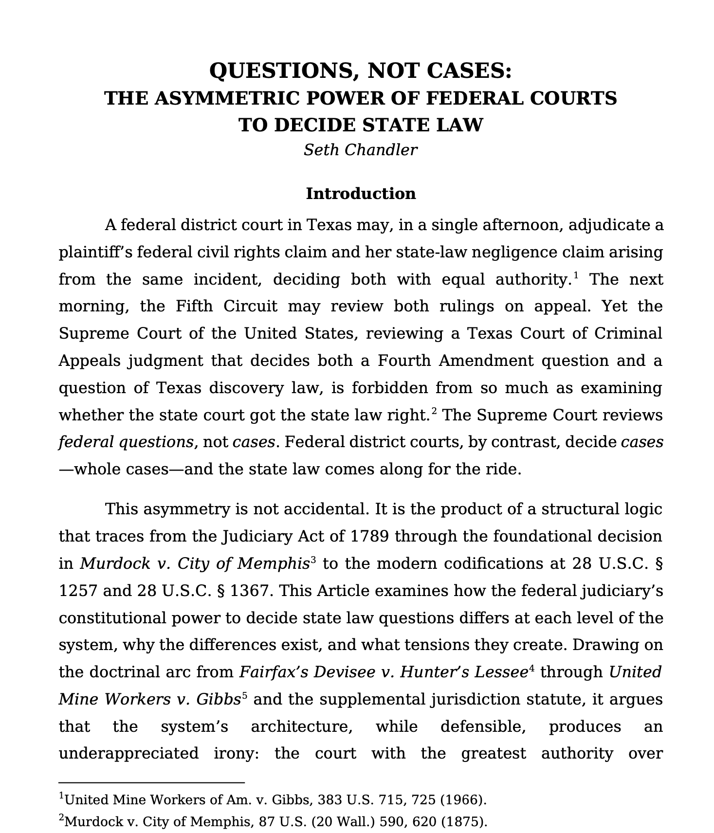 At this point Claude Cowork had gone past what I would ordinarily discuss with a first year law class and into a more sophisticated exploration of the different treatment of related state claims when handled by a federal trial court and when handled by the Supreme Court. The end result of my collaboration with GOAI4L was a short law-review-style document that it titled "Questions, Not Cases: The Asymmetric Power of Federal Courts to Decide State Law."
