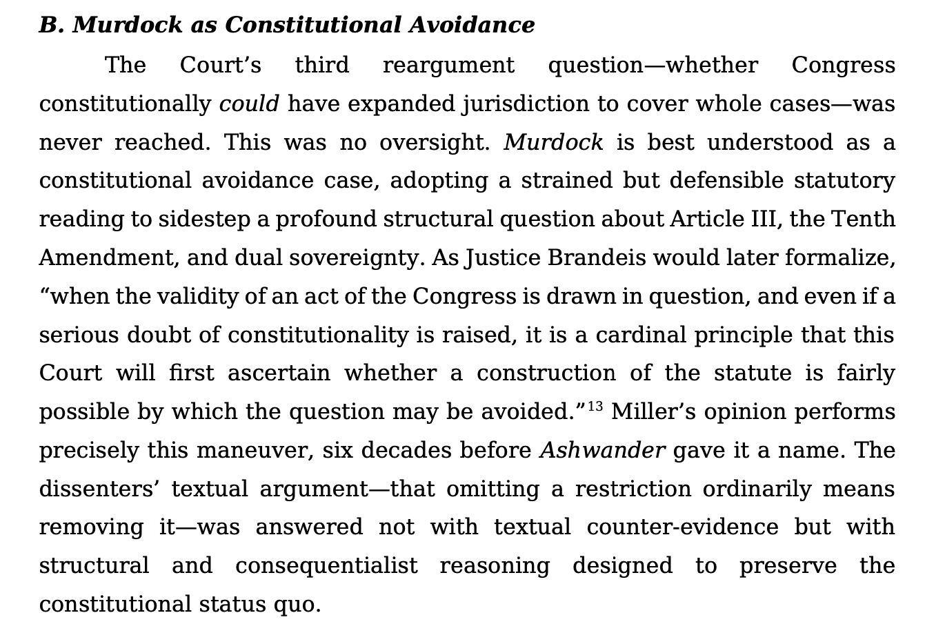 Here's a section from that same Word file relating the Murdock case and modern Supreme Court jurisdiction doctrine to Fairfax's Devisee v. Hunter's Lessee, a case that it was able to actually read, not just rehydrate from non-specific training data: