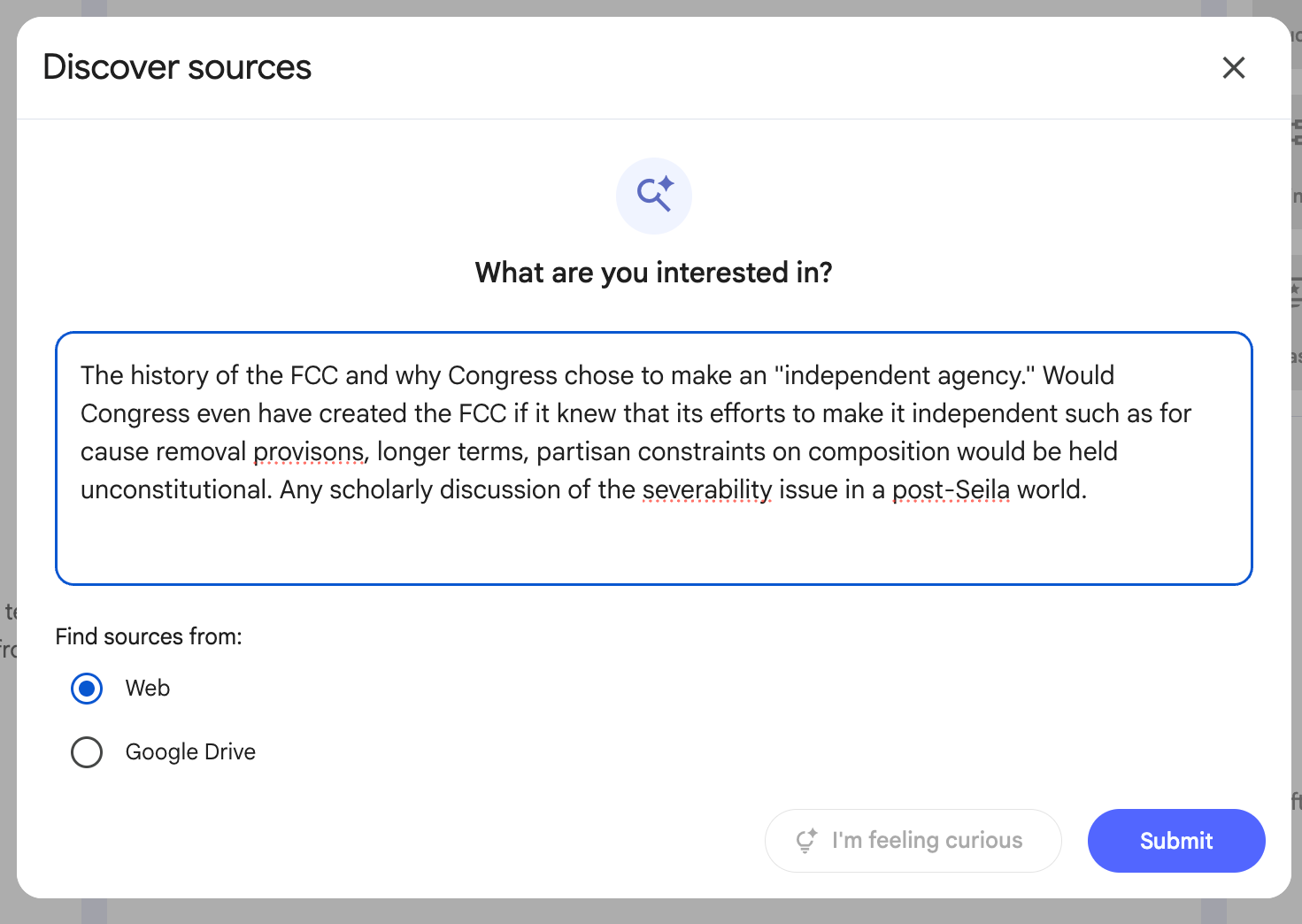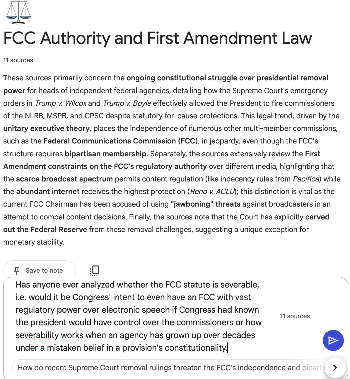 Moreover, see that blue button "Discover sources"? That's a new feature of NotebookLM that leverages the fact that this is, after all, a Google product. You don't have to go outside of NotebookLM and use a search engine (including AI search from Google itself) to find materials relevant to your notebook. You can do so all within NotebookLM. Here I ask NotebookLM to find sources on a severability question: if Congress knew that its efforts to make the Federal Communications Commission independent would be held unconstitutional, would it have given the Executive branch as much power to regulate the emerging electronic media?