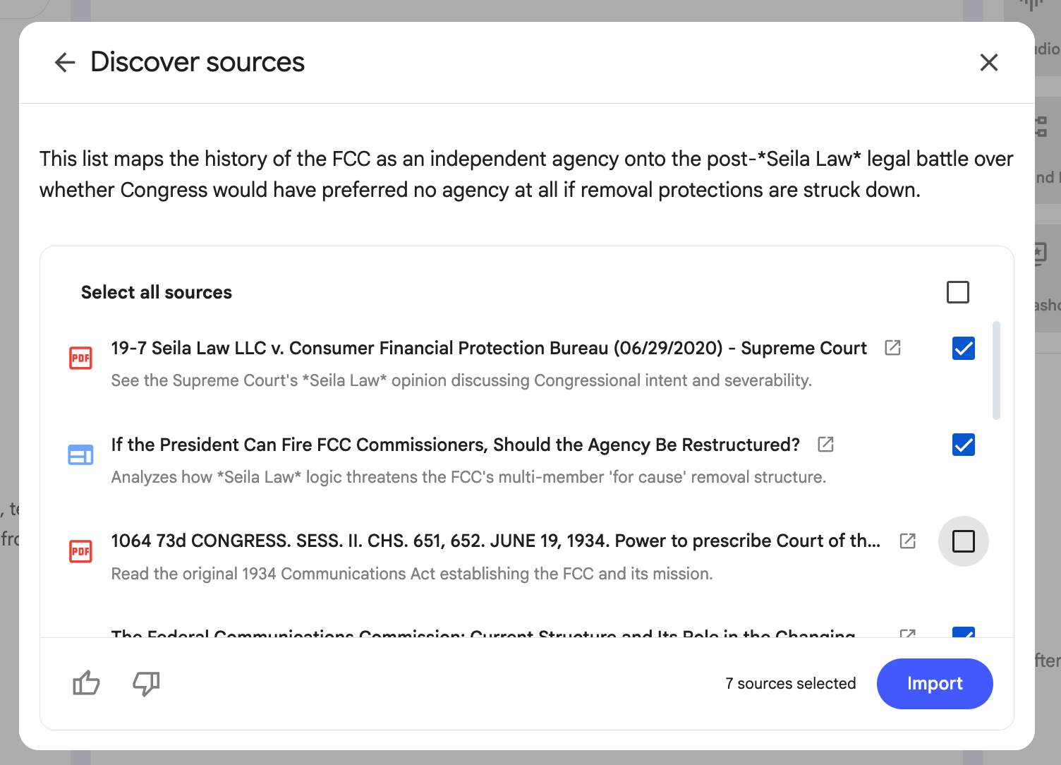 NotebookLM comes back with a list of possible sources. You can review them and decide which one of them you want to import as a source. Here, you can see I've provisionally decided not to include the original FCC statute, which may or may not be a good choice.