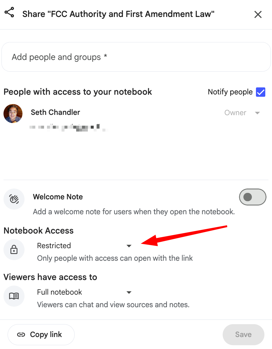 By the way, if you stopped right here you would still have a useful product. You basically have an anthology of materials on a topic you have chosen. You could definitely just give this compendium to your students – or, if you are a student reading this, to a cooperative friend via an exchange – and let them explore. Sharing NotebookLMs is trivial. It follows the typical Google protocol for sharing. If you want to share it with just the favored few, you put their email address at the top. You can let them be a mere viewer or, if you have confidence in their abilities, you can let them become an editor. Moreover, if you want to share it with the world, change the Notebook Access setting from "Restricted" to "Anyone with a Link."