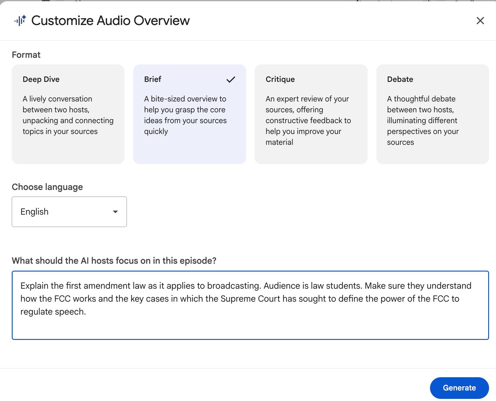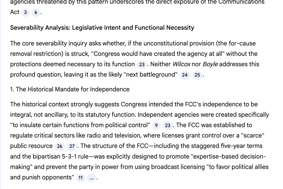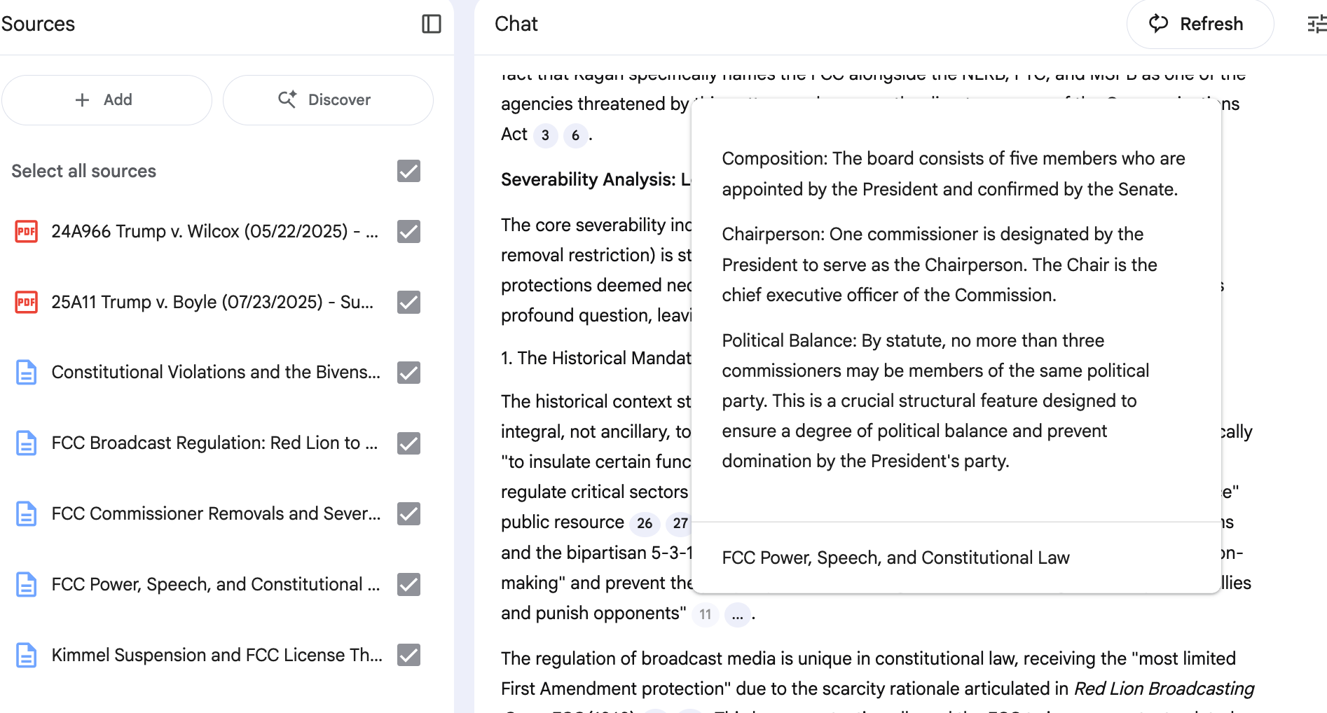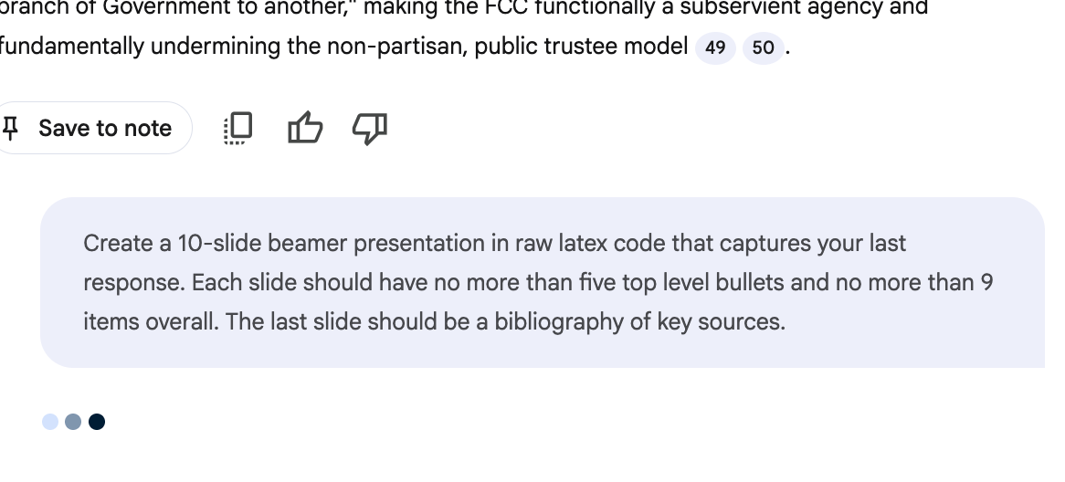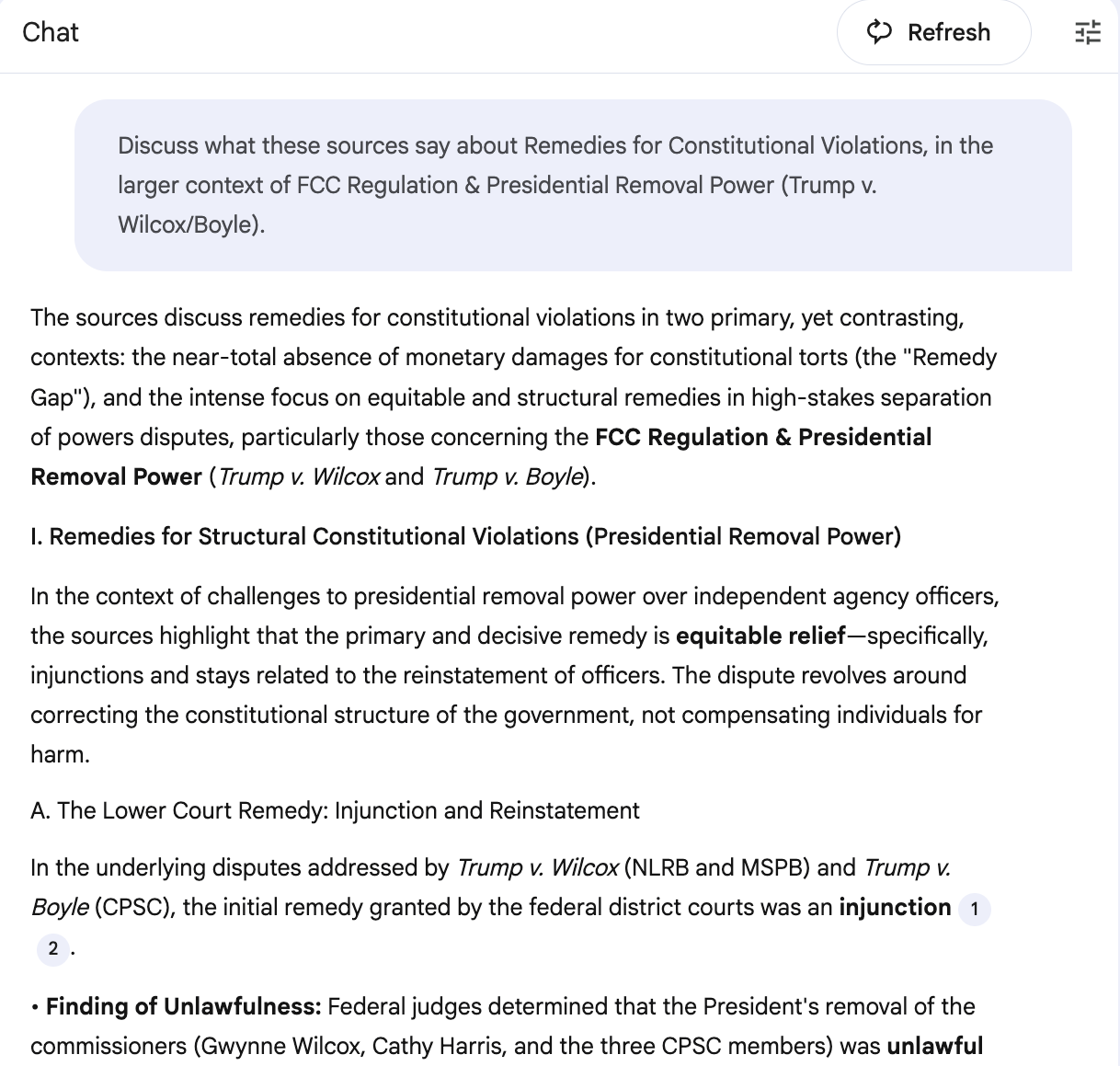 The flagship feature of NotebookLM is its ability to produce synthetic podcasts. In recent months, Google has enhanced this feature with customizations. It's no longer just the "Deep Dive" with the two synthetic hosts weaving your materials together in an engaging (though sometimes platitudinous) discussion. You can create little soundbites or debates. Here's a prompt to create a soundbite and the outcome. You can listen here to a good quality "debate" created by NotebookLM based on our sources about the links between presidential removal powers and first amendment rights of broadcasters. You can, by the way, download these podcasts and then listen to them on a dog walk or while driving.