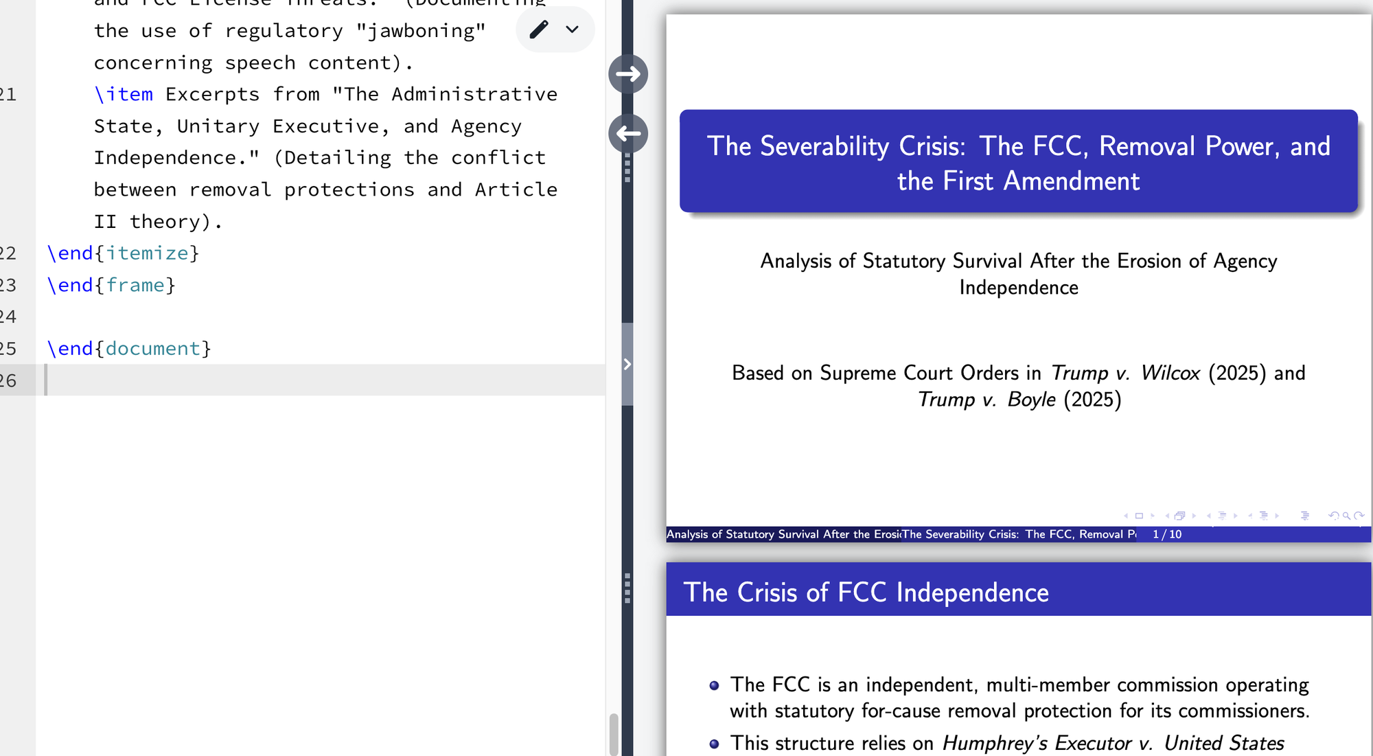 You can be quite creative in the kinds of questions you ask NotebookLM. Here, I follow up on the previous discussion and ask it to produce a 10-slide "Beamer presentation" (like PowerPoint) that would explain the severability issue to law students.