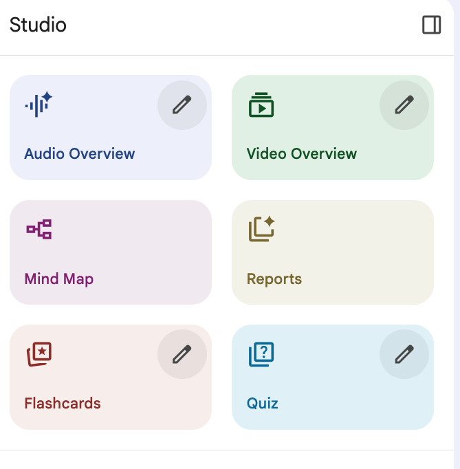 Giving it sources is about as simple as it gets. When you launch a new notebook you see a screen like the one shown below. You can just give it one of your own files from either your local storage (it likes PDF!) or Google Drive, a URL (website), a YouTube video, or, quite usefully, text you just paste in. That last option means you can readily port the work of other LLMs that have generated custom text that you like and feed it into the knowledge base. And there's a feedback loop. Once NotebookLM starts producing material for you (discussed below), you can make outputs that you like yet another source. This is a form of reinforcement learning in which good work by NotebookLM is rewarded and taken into account in its future activities.