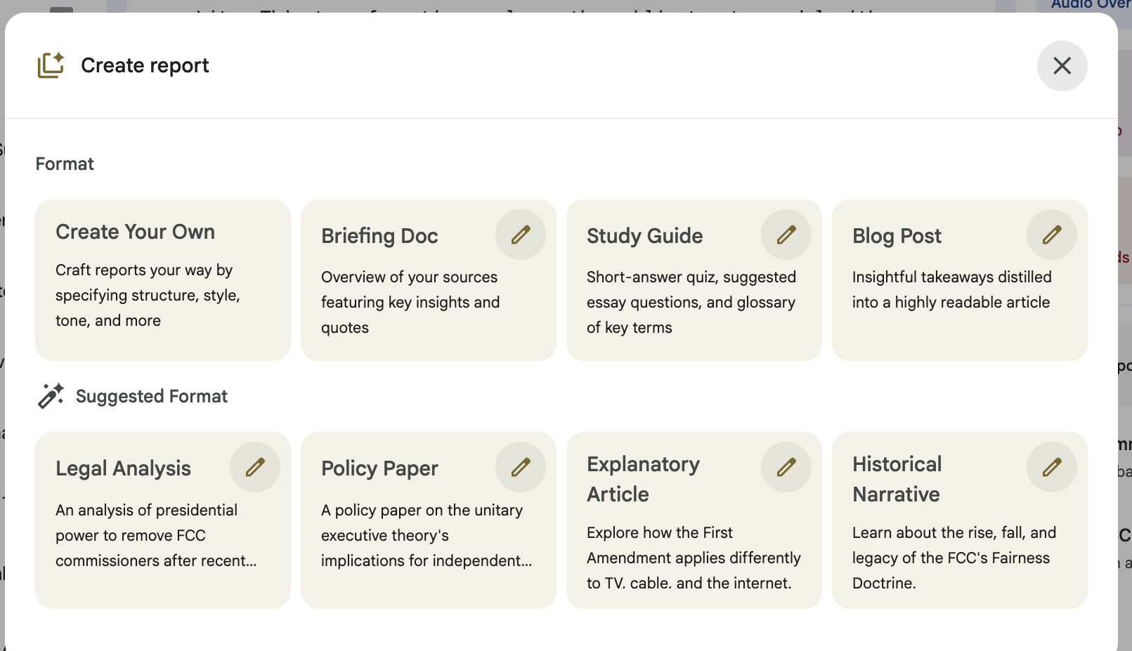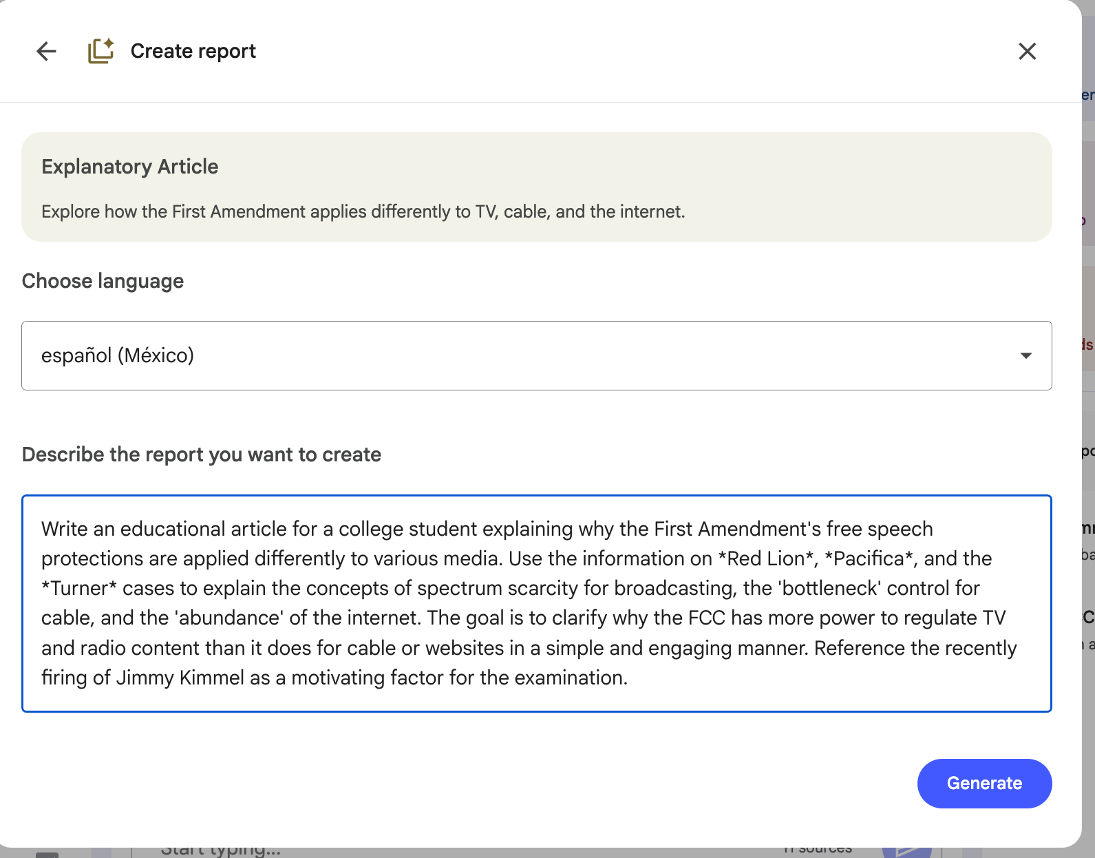 The Reports task lets you select from either a customizable menu of standardized report topics such as briefing documents, study guides or even blog posts (!) or uses the intelligence of AI to suggest topics that might be of interest. And each of these menu items can be customized to your liking. Thus, I can have it draft an Explanatory Article on how the First Amendment applies differently to TV, cable, and the internet.